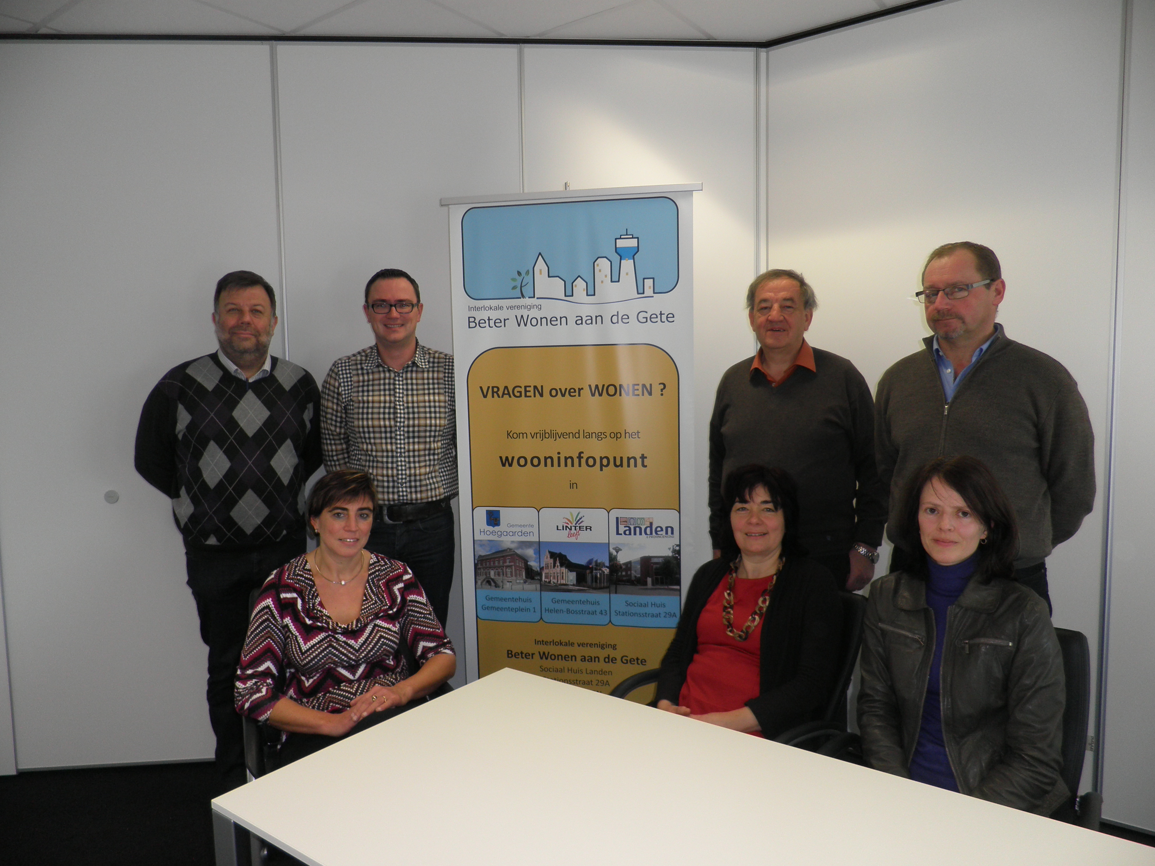 Het beheerscomité van Beter Wonen aan de Gete werd gevormd. Projectcoördinator Katja Calsyn stelt met trots de nieuwe leden voor. Van links naar rechts ziet u Marleen Vannieuwenhuijsen (Linter), Marleen Lefevre (Hoegaarden) en Katja Calsyn zitten en staand Didier Reynaerts (Landen), Andy Vandevelde (Linter), Willy Lambrechts (Hoegaarden) en Marc Lecocq (Landen). De nieuwe leden kozen unaniem Andy Vandevelde als voorzitter en Marleen Lefevre als ondervoorzitter.