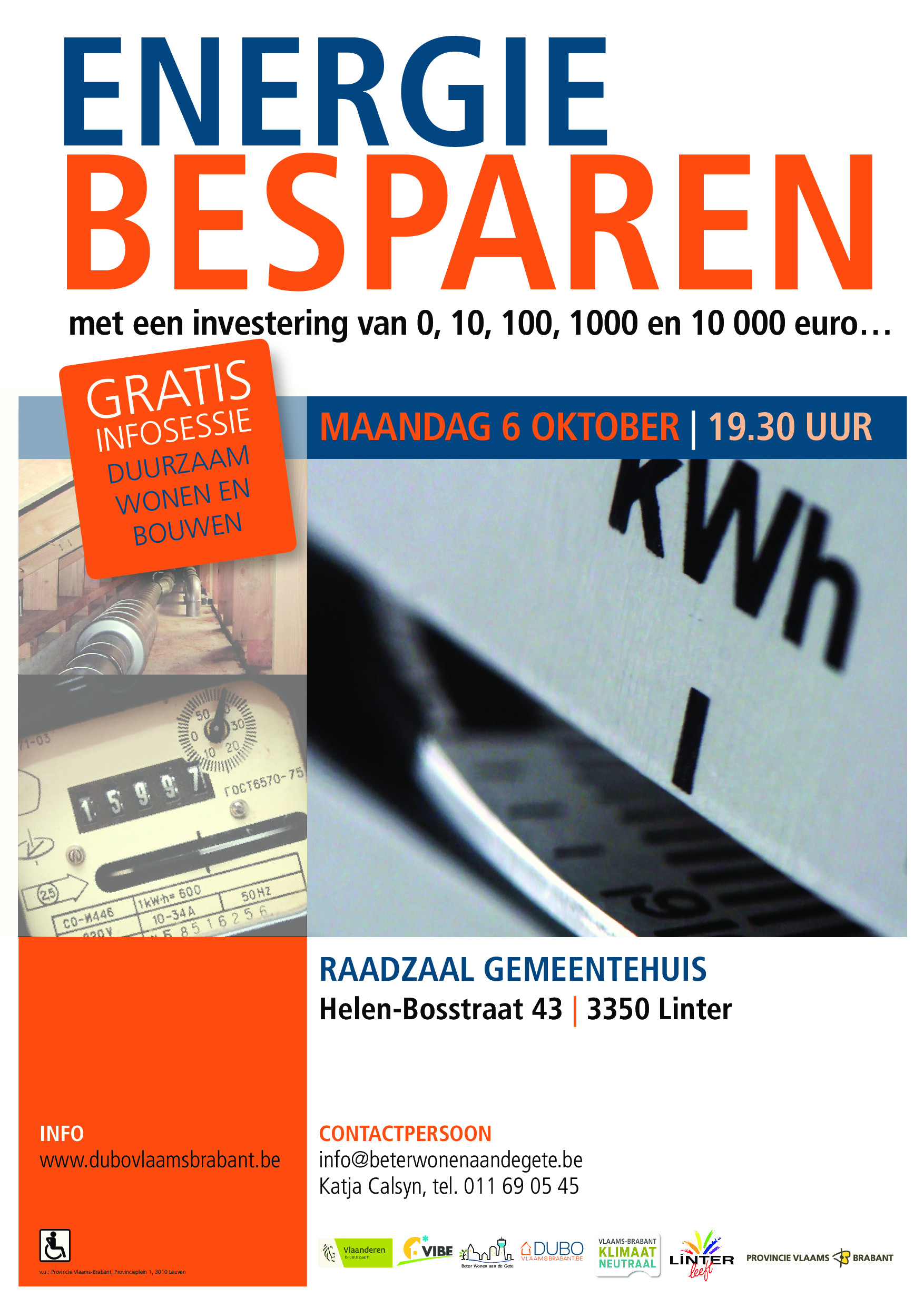 Energiezuinigheid is één van de voorwaarden om te komen tot een bio-ecologische woning. Energie besparen betekent geld besparen. Tijdens deze voordracht gaan we in op een aantal zeer concrete ingrepen die iedereen thuis kan uitvoeren, ook zonder zware investeringen of verbouwingen. We leggen praktijkgericht uit hoeveel je kan besparen met een klein, middelgroot of groot budget. Wat kan met jouw budget en hoeveel bespaar je ermee? Spaarlampen, radiatorfolie, thermostatische radiatorkranen, verbeterd dubbel glas, zonneboilers, isolatie, hoogrendementsketels…Het komt allemaal aan bod. Ten slotte gaan we ook in op het belastingvoordeel en de subsidiemogelijkheden voor energiebesparende maatregelen. U bent van harte uitgenodigd op deze infovergadering op maandag 6 oktober 2014 om 19:30u in de raadzaal van het gemeentehuis, Helen-Bosstraat 43, 3350 Linter. Deelname is gratis. Wenst u meer informatie, dan kan u steeds contact opnemen met Katja Calsyn, projectcoördinator woonbeleid, e-mail:info@beterwonenaandegete.be, tel. 011/ 69 05 45. De infoavond wordt georganiseerd i.s.m. VIBE vzw en met de steun van de provincie Vlaams-Brabant, Steunpunt Duurzaam Bouwadvies en het Vlaams gewest. | ![]() |