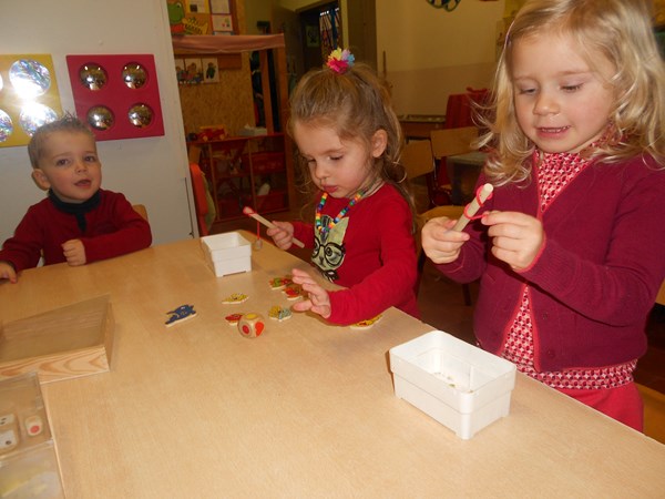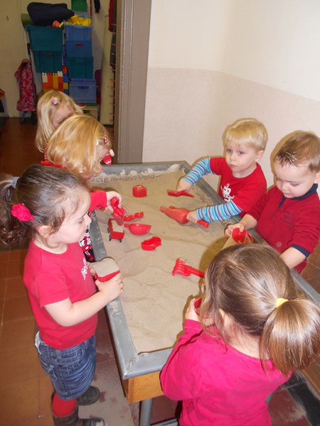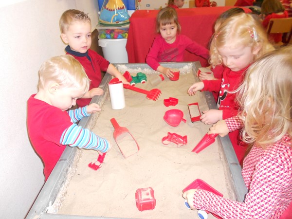 Spelen in de zandbak met rode voorwerpen...