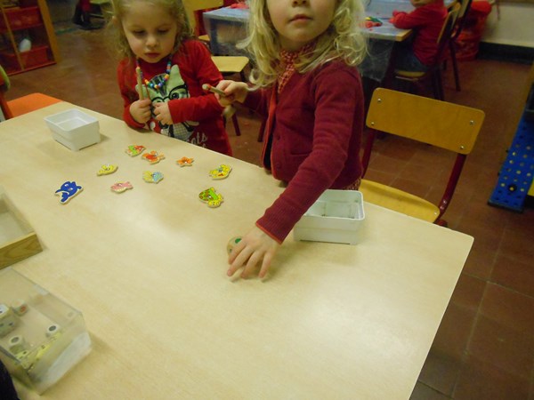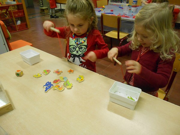 Het kleuren-visspel.... eerst de kleurendobbelsteen gooien en dan hengelen naar de vis met de juiste kleur !