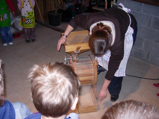 Het gemalen graan (meel) valt in de bak onderaan.