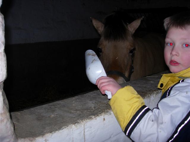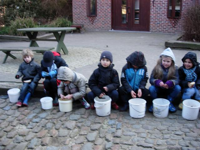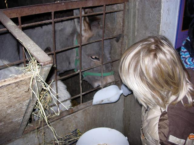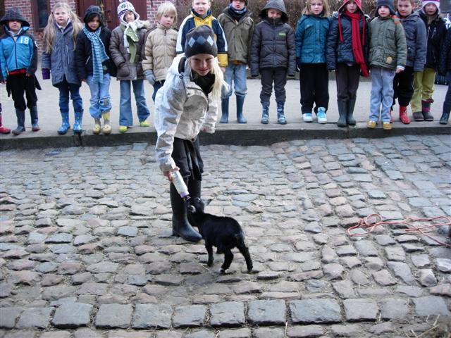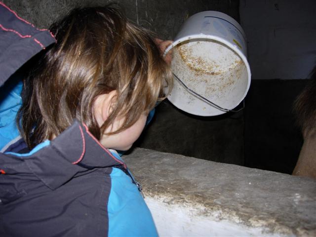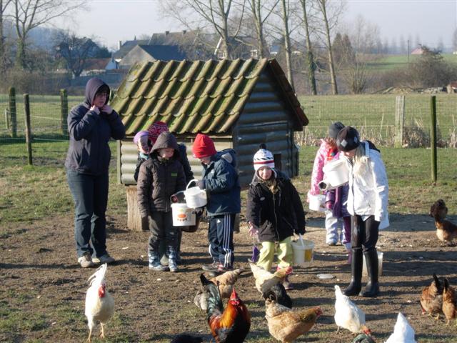 De dieren van de jeugdhoeve voederen.