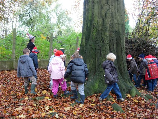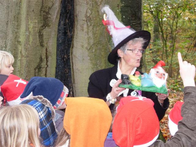 De kabouters in het bos.Hier zien we kabouter Jan. Hij dronk heel graag bier en wijn uit een ton.Hier zien we kabouter Krui. Hij reed steeds met zijn kruiwagen rond.Waar heeft die andere kabouter zich verstopt?