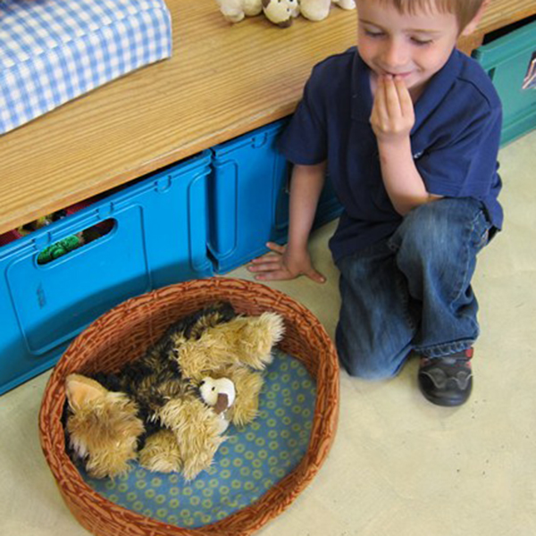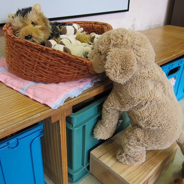 Juf vertelt dat de kleintjes eerst een tijdje bij hun mama blijven wonen, omdat ze nog niet zelf kunnen eten of drinken, en nog niet kunnen rondlopen. Maar als ze dat snel allemaal leren, wordt de mama-hond de kleintjes wel wat beu om al die drukte en dan gaan ze vanaf dan bij een nieuw baasje wonen.