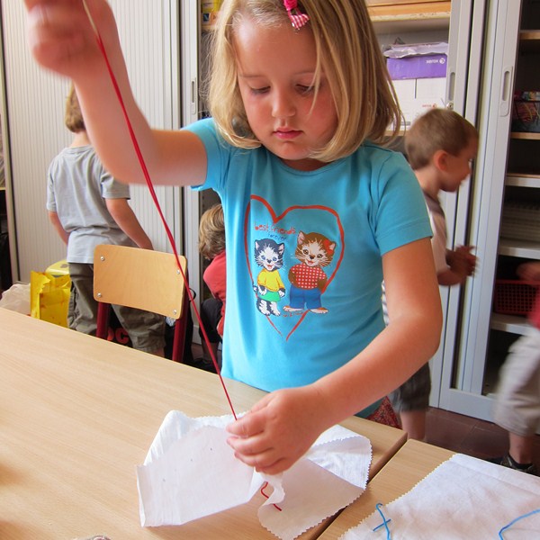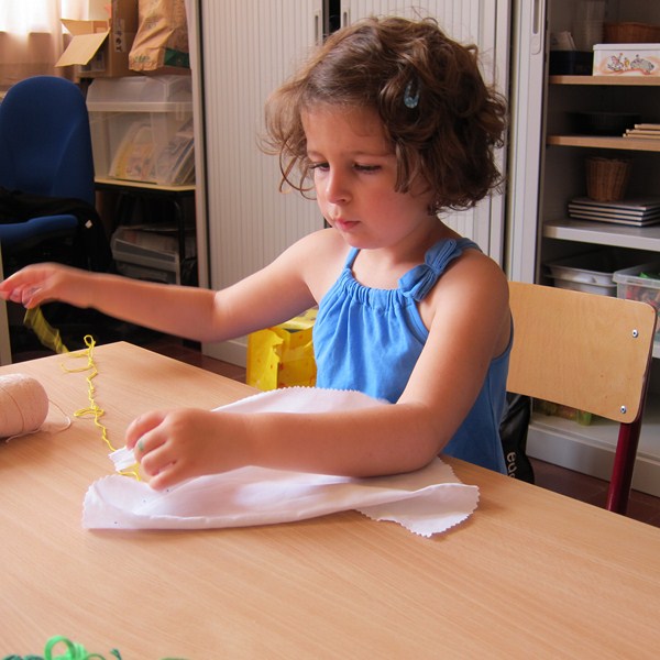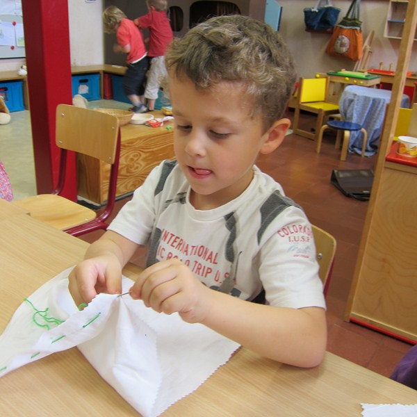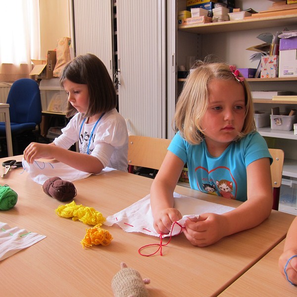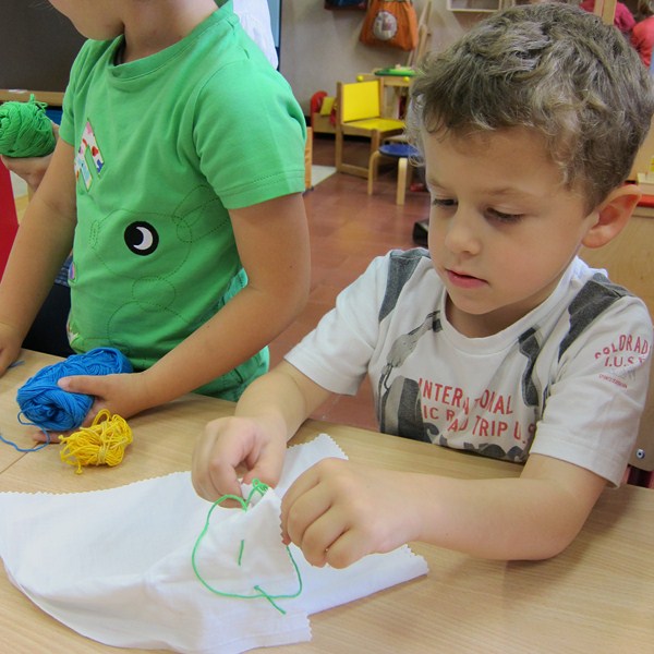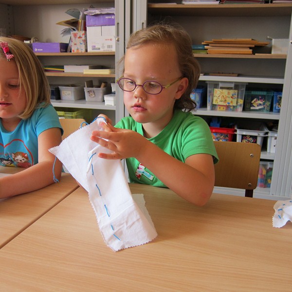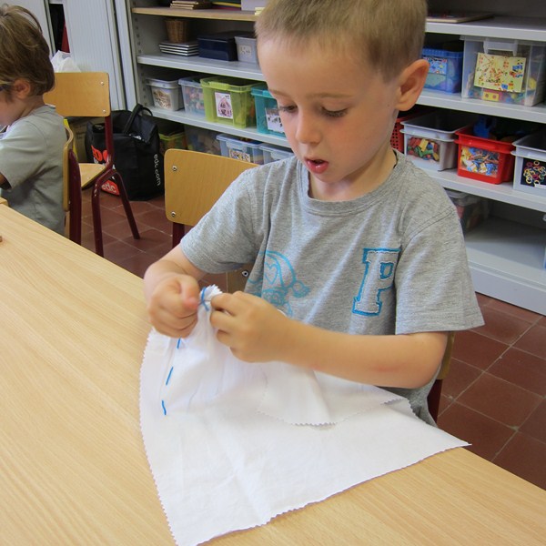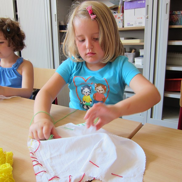 Vandaag maken we daarom alvast een zachte knuffellap voor onze pup. Dat doen we niet zomaar. De kleuters zijn immers al maandenlang nieuwsgierig naar hoe je kan naaien. En dit is dan het moment. Enkelen willen het beslist proberen. Er worden kleurige steekjes genaaid en af en toe wordt er zelfs een lapje stof aan vastgemaakt.