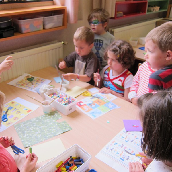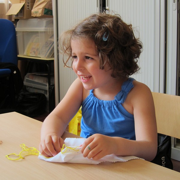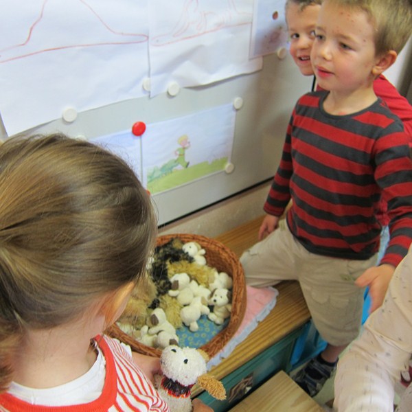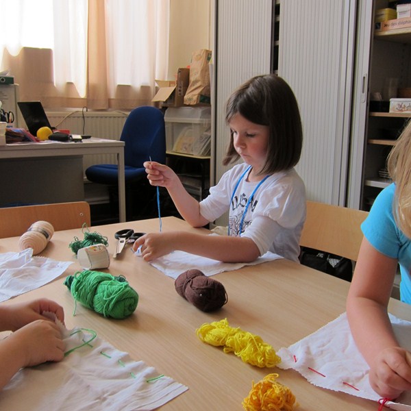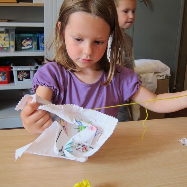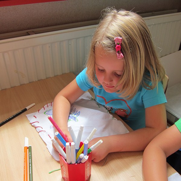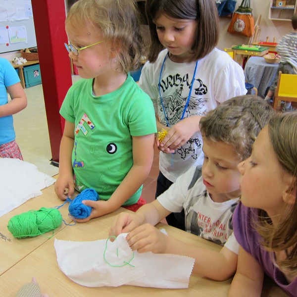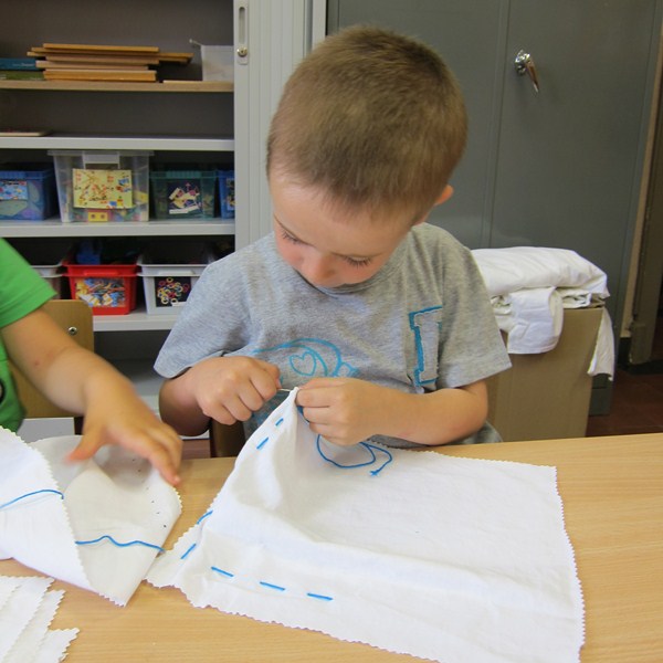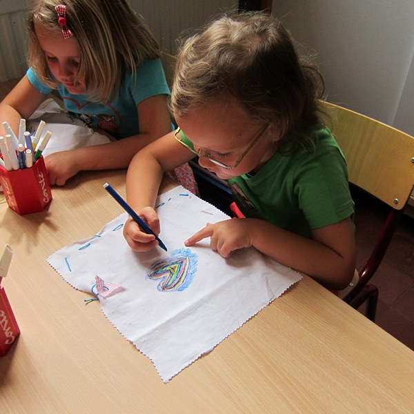 Vandaag maken we daarom alvast een zachte knuffellap voor onze pup. Dat doen we niet zomaar. De kleuters zijn immers al maandenlang nieuwsgierig naar hoe je kan naaien. En dit is dan het moment. Enkelen willen het beslist proberen. Er worden kleurige steekjes genaaid en af en toe wordt er zelfs een lapje stof aan vastgemaakt.