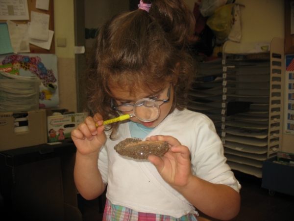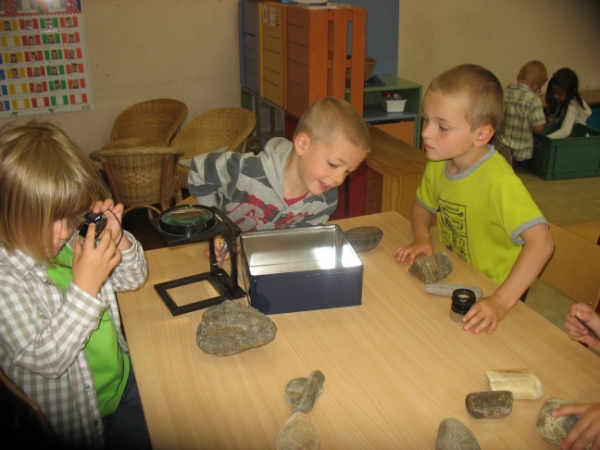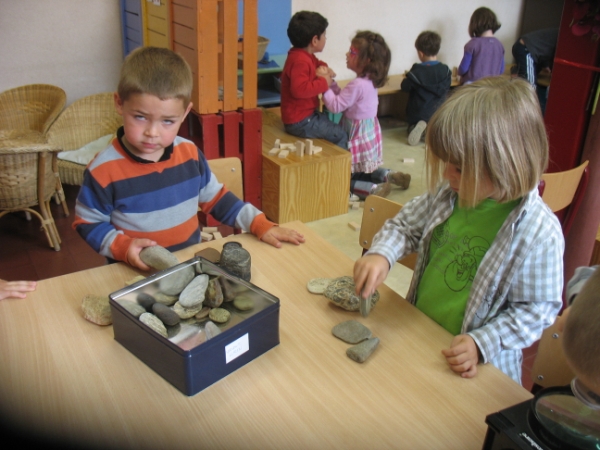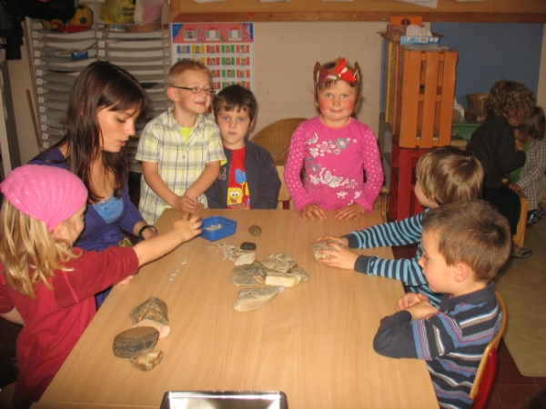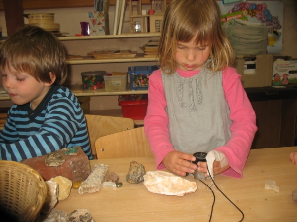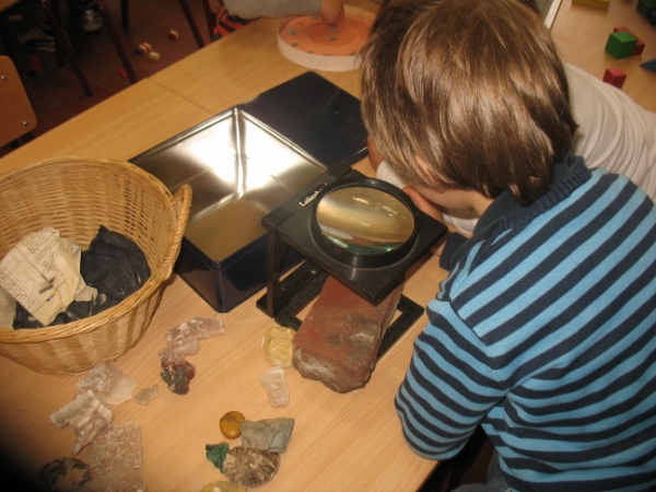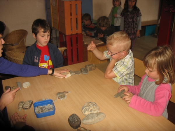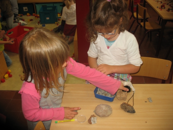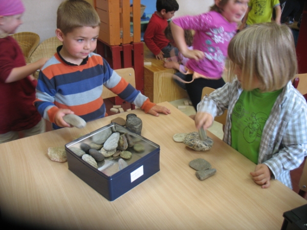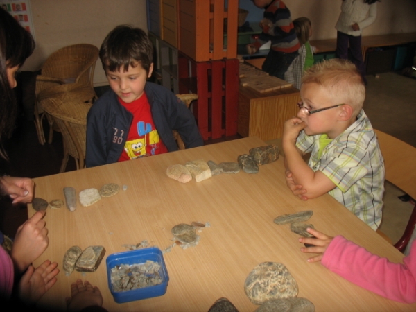 Die gaan we eens onderzoeken: hoe zien ze eruit? Welke zijn groot, welke klein? Welke kleuren en vormen? Hoe zwaar zijn ze? Waar komen ze vandaan? Waarvoor worden sommige stenen gebruikt? Zijn ze glad of ruw of hard? En er was ook een zachte zwarte steen die doormidden brak.