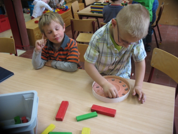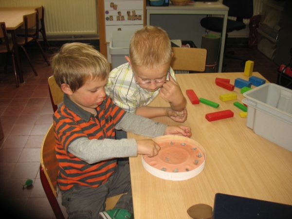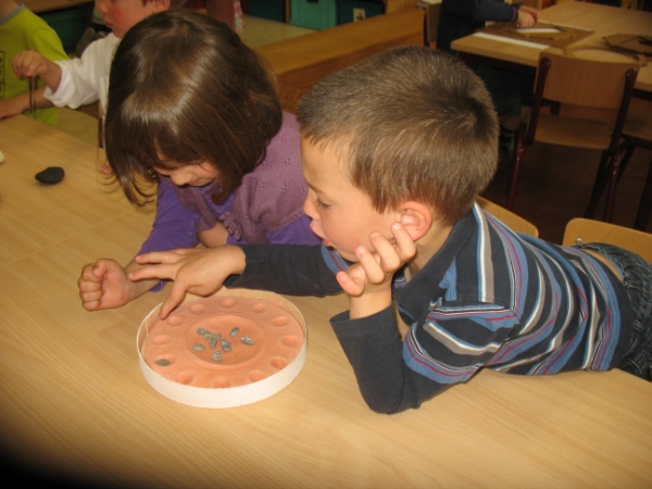 Met 11 kleine steentjes spelen we een oud afrikaans bordspel. Wie houdt de minste stenen over op het eind? Enkele kleuters zijn zo gedreven in het spelen van dit spel dat ze er snel in slagen slechts 1 steentje over te houden.