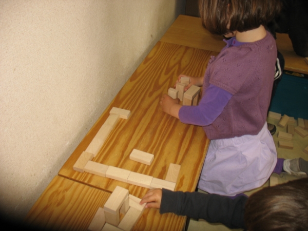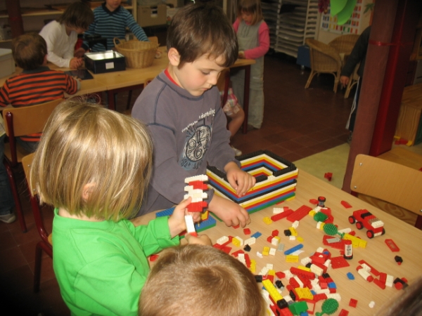 Met lego en duplo-stenen bouwen we huizen. En met dominosteentjes met edelsteentjes er op een schitterende toren.
