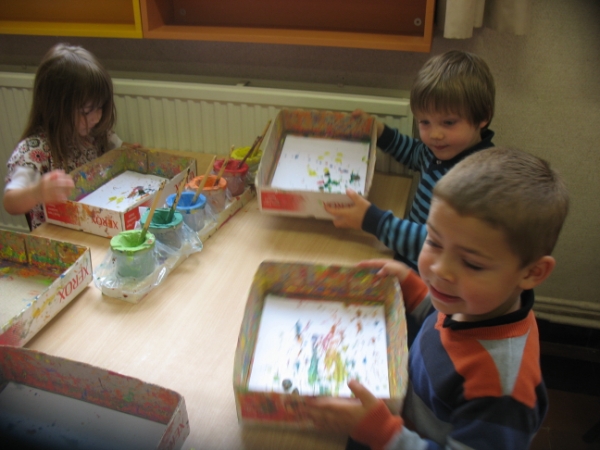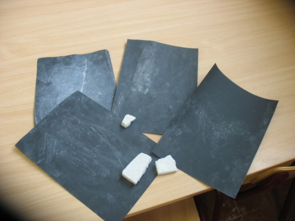 Stukken van sommige stenen gebruiken we om op een zwart blad te krassen en schilderen met stenen doen we door ze heen en weer te schudden in een deksel met verfspatten.