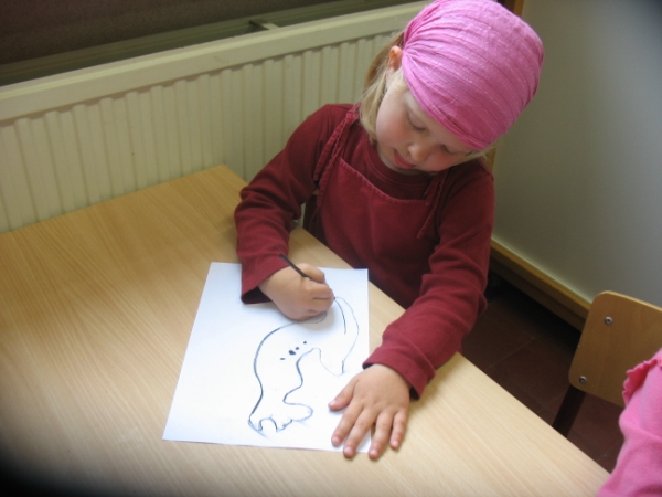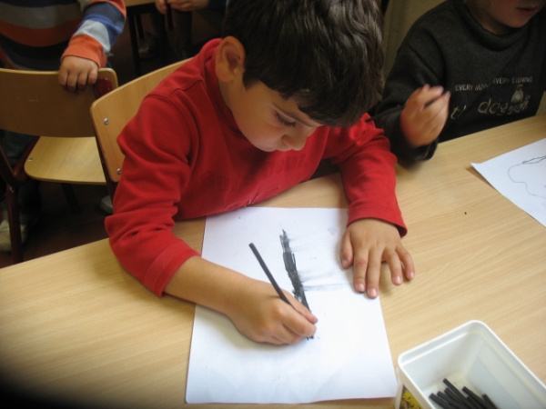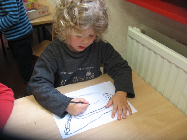 We kijken naar fossielen en praten over diertjes en bomen die bij een aardbeving bedolven raakten onder bergen steen. Daarna schilderen we met houtskool.