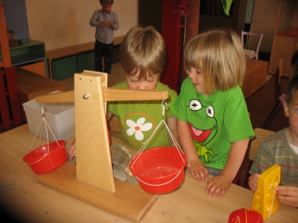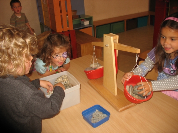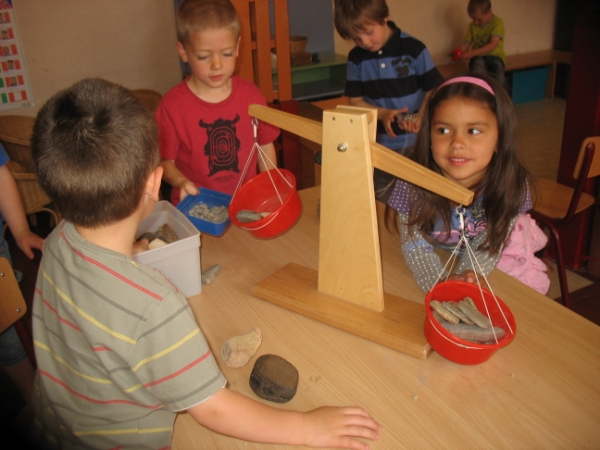 Welke stenen zijn het zwaarst? En hoeveel stenen moeten we bijvoegen in de ene schaal van de weegschaal om ze weer in balans te krijgen?