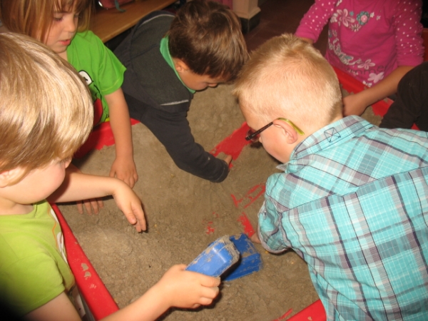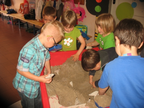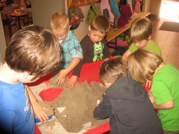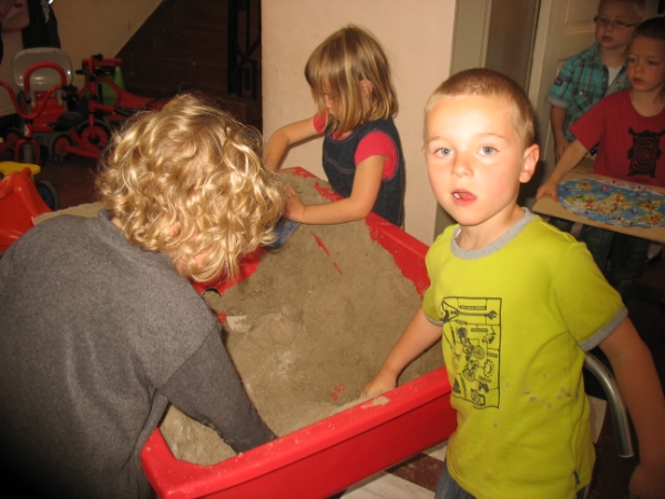 Dat verhaal spelen we na in de zandbak van de eerste kleuterklas. Al het speelgoed moet er uit. De maïskorrels mogen blijven zitten. Die lusten onze geknutselde muizen immers ook nog wel. De stenen doen we er ook in. We maken het zand nat, zodat we er een eiland met bergen, rotsen en holen mee kunnen maken.
