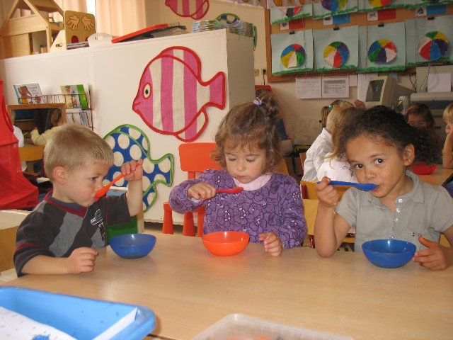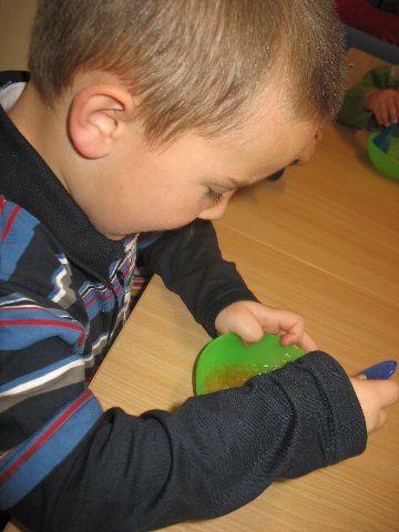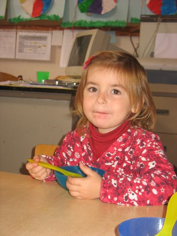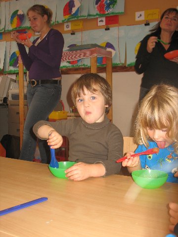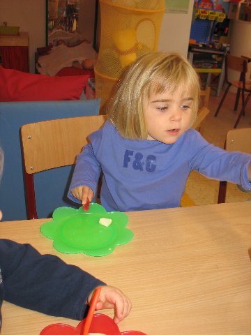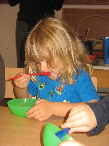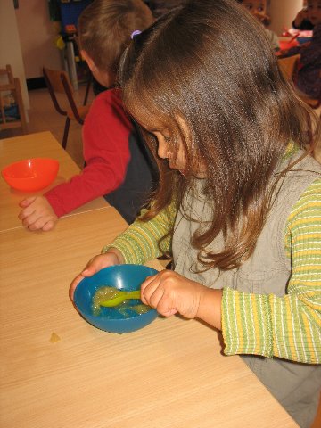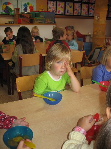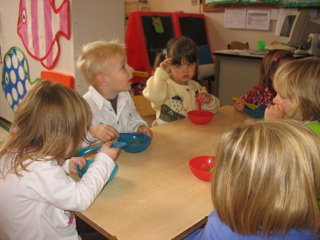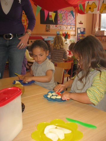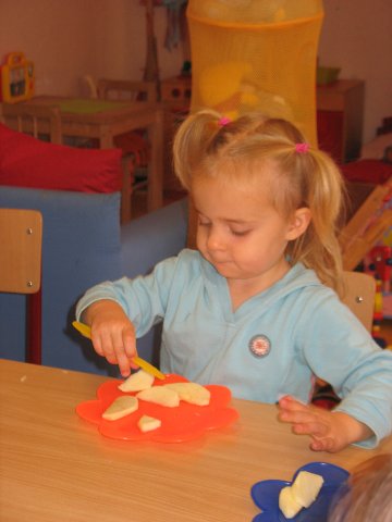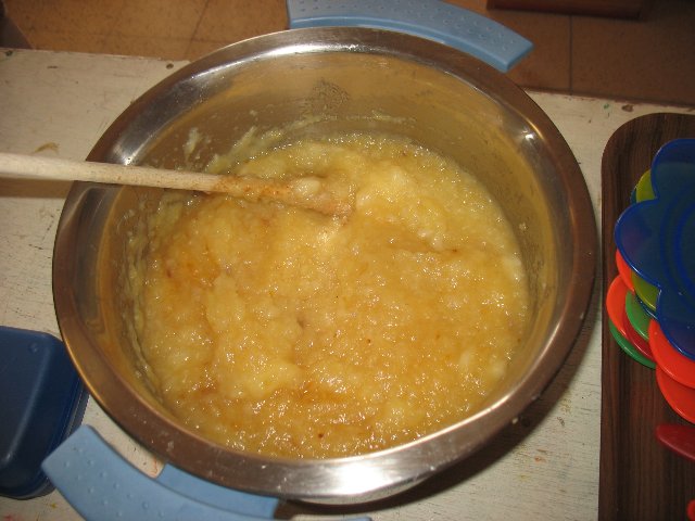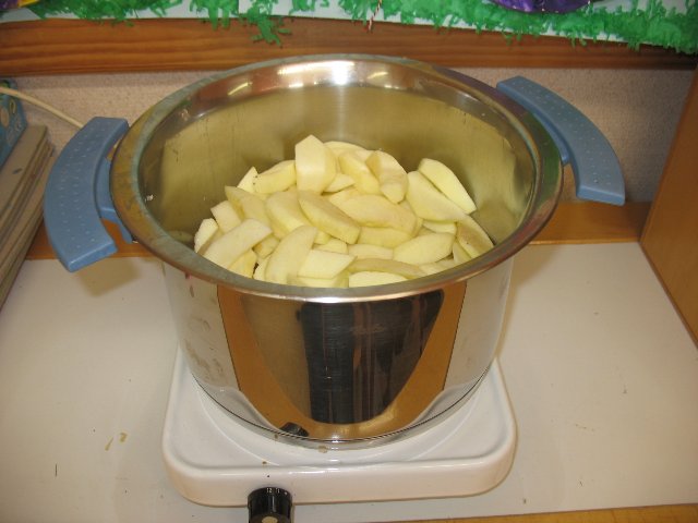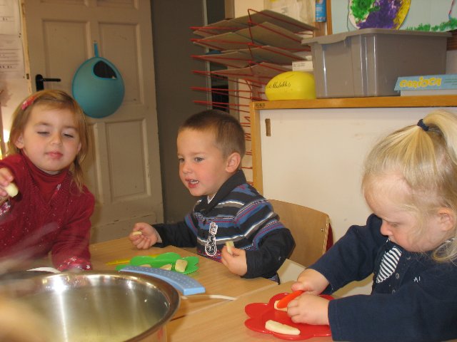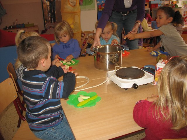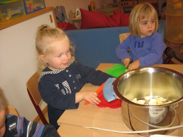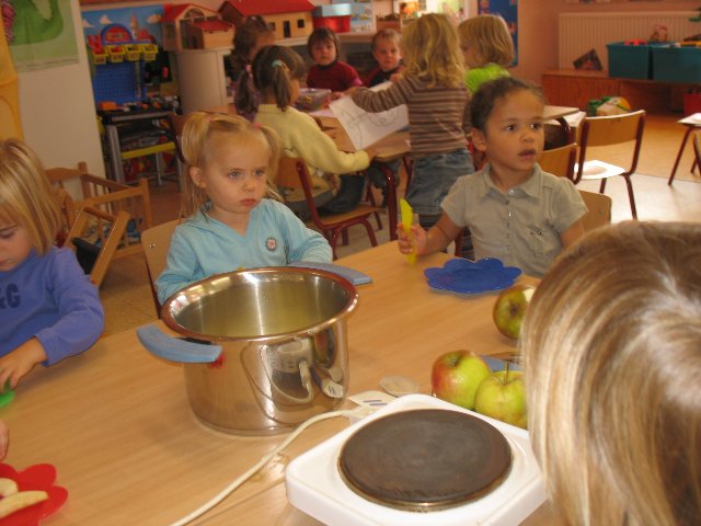 Mmmmm, we maken heerlijke appelmoes. Juf schilt de appelen en wij mogen ze in stukken snijden en in de kookpot doen.