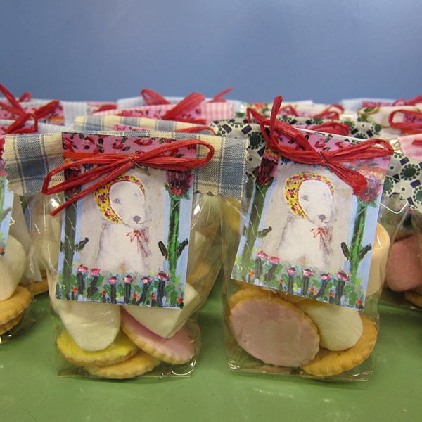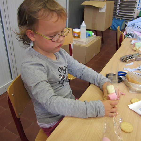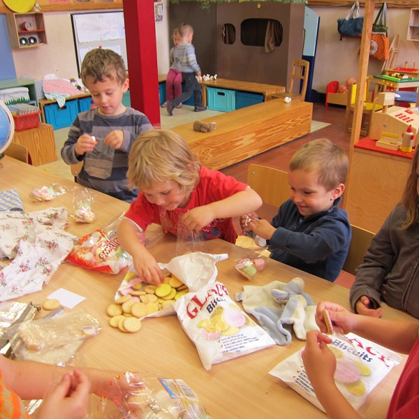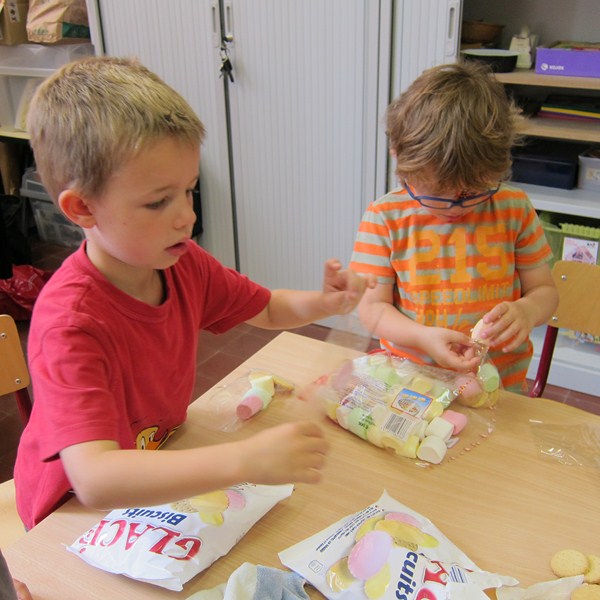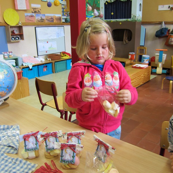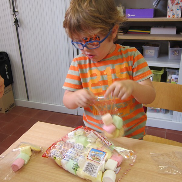 En wij vullen heel veel snoepzakken, met precies 3 malse snoepjes en 3 koekjes. Al moeten die ook telkens een andere kleur hebben.