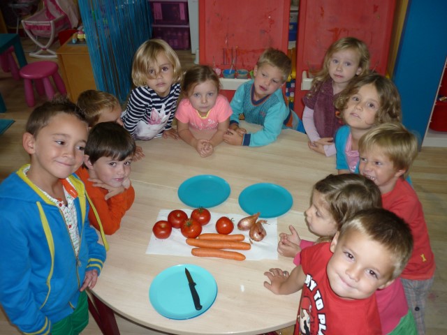 We gaan soep koken. Tomaat, wortel en ajuin liggen klaar om te snijden.