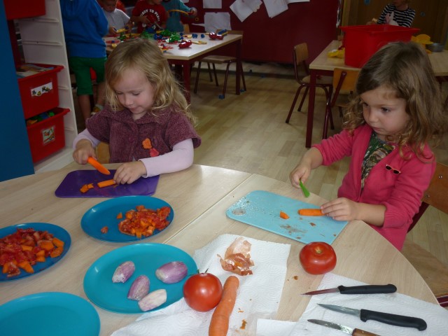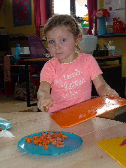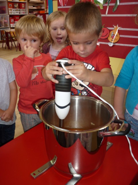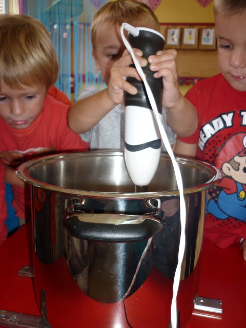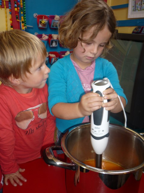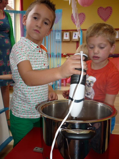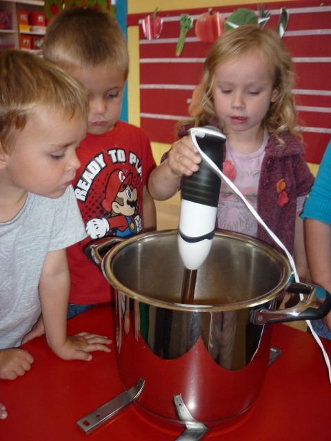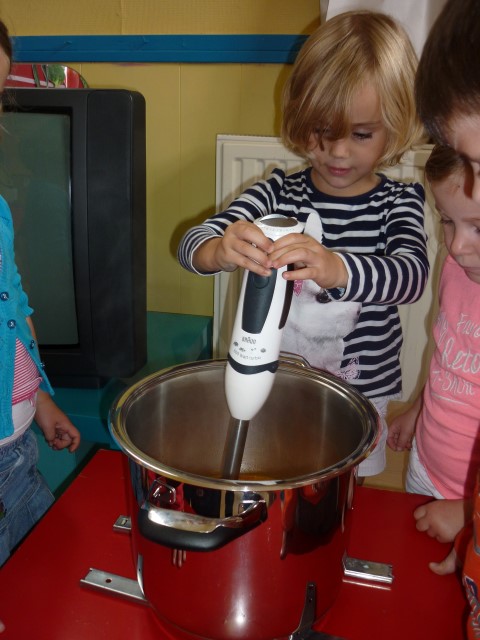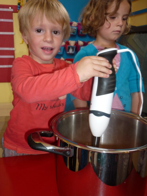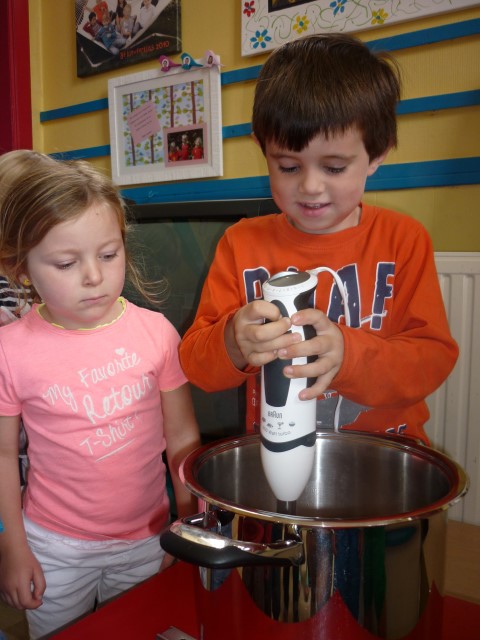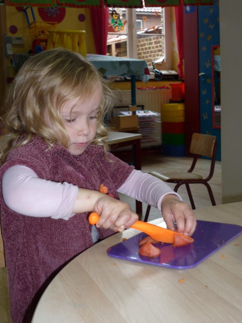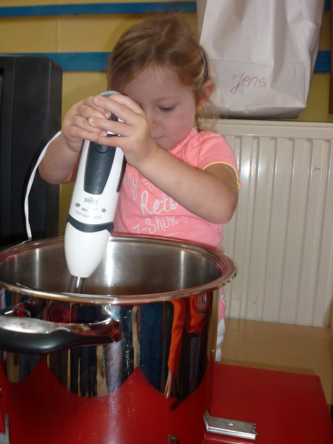 Bij de groenten snijden, bij het mixen, bij het afwassen, bij het werken...?