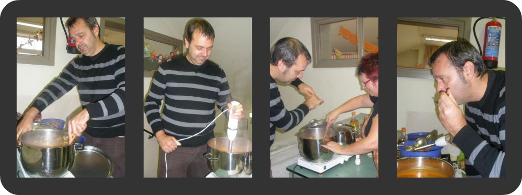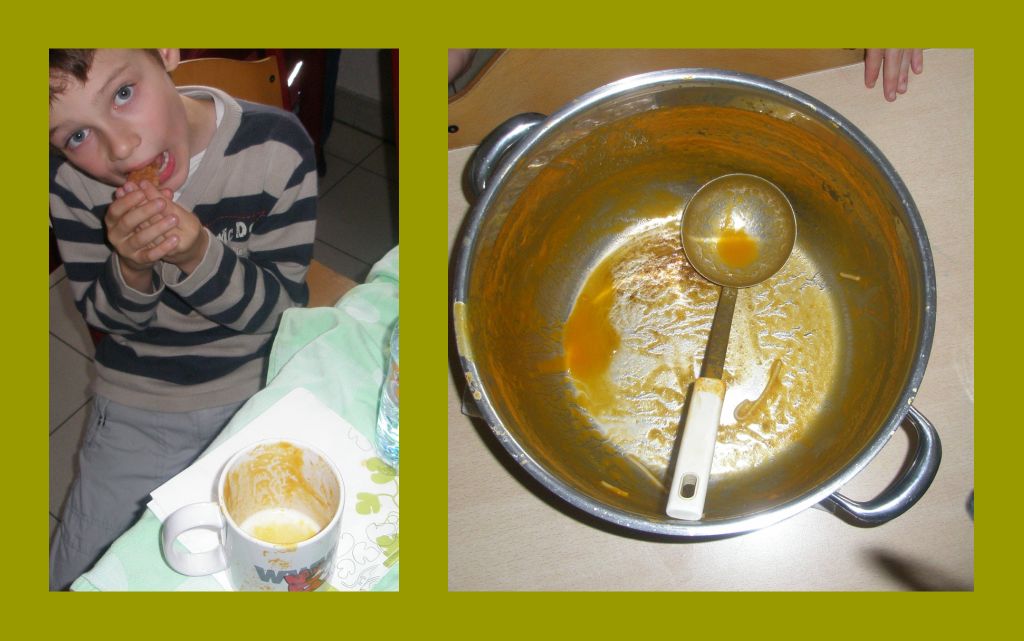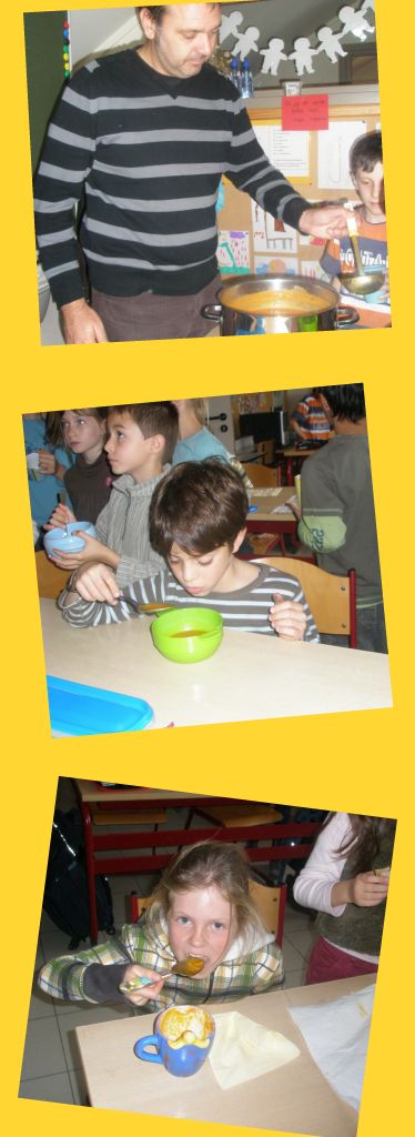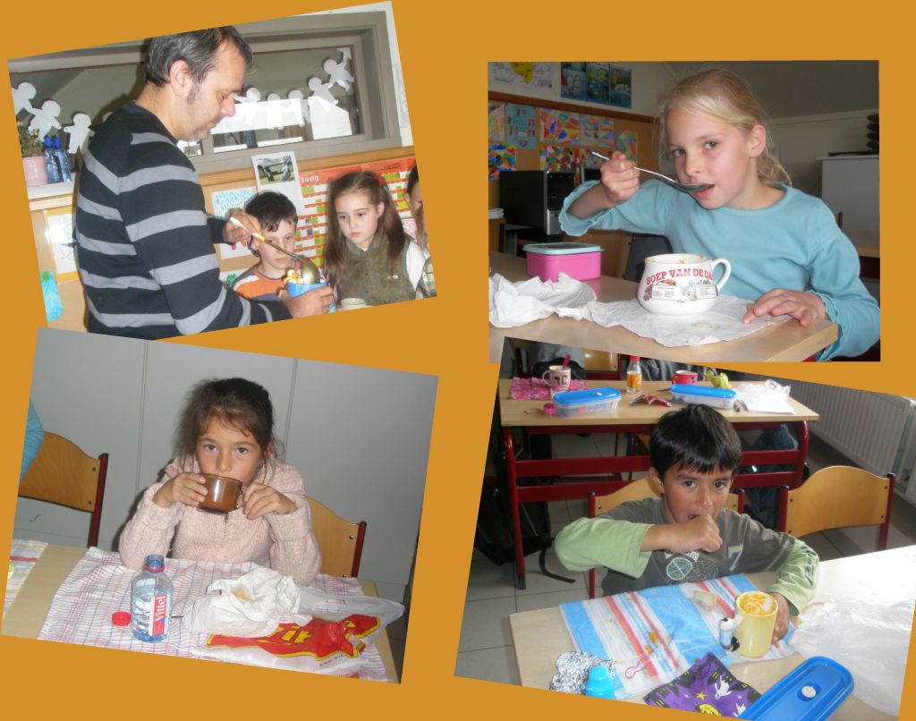 Het recept van onze soep: eerst potteke roeren, dan potteke mixen, vervolgens potteke kruiden (met hulp van onze lieftallige juf Lily) en tenslotte potteke proeven.
