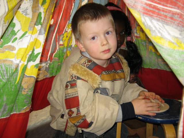 Indianen houden van de zon dus gaan we vlug naar buiten. Daar doen we onze indianendans rond de tipi.