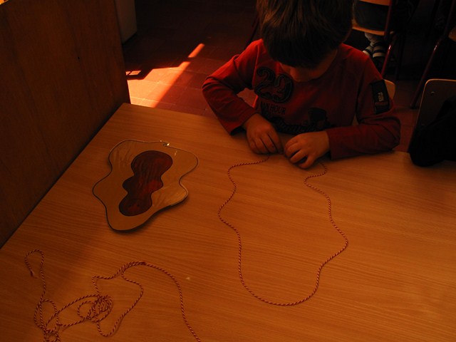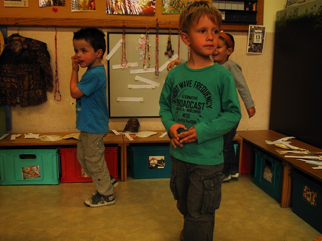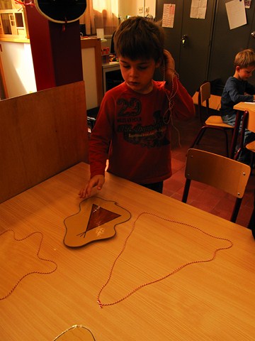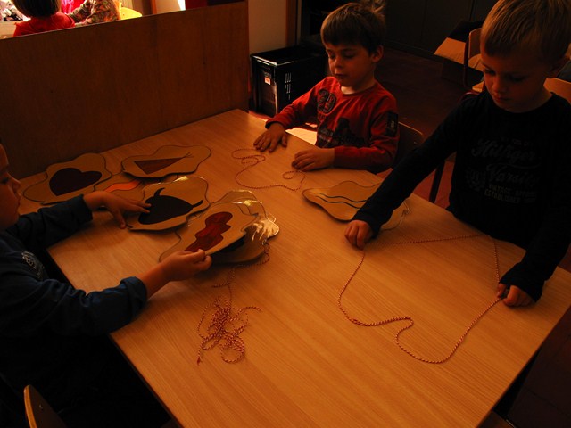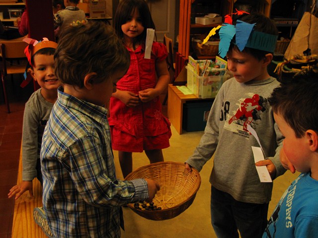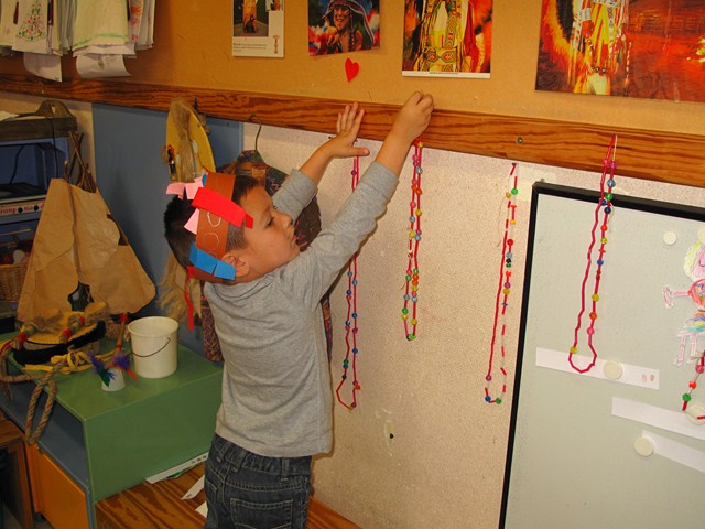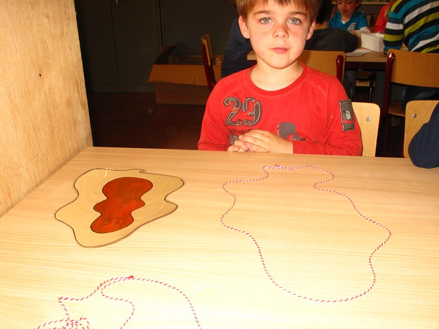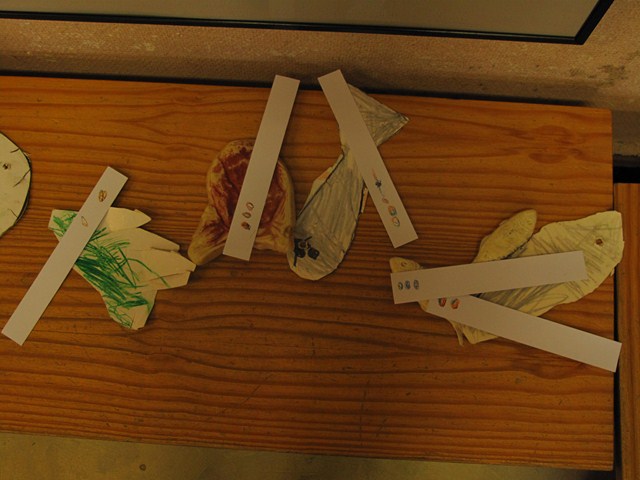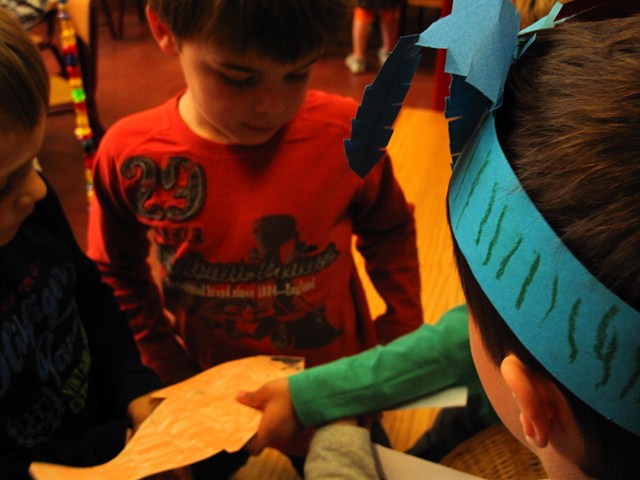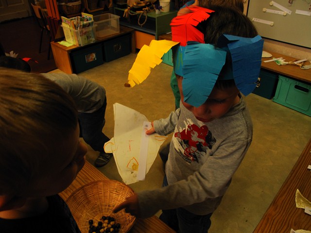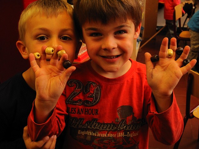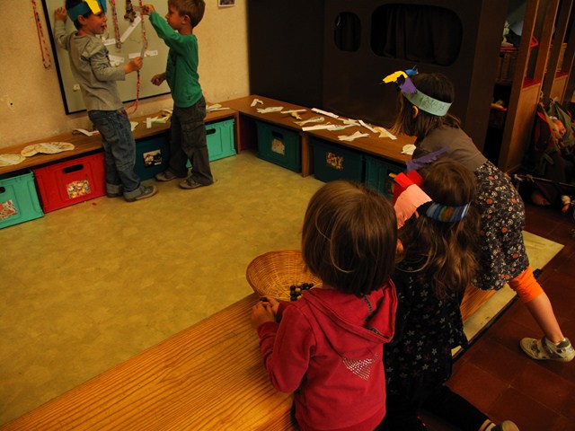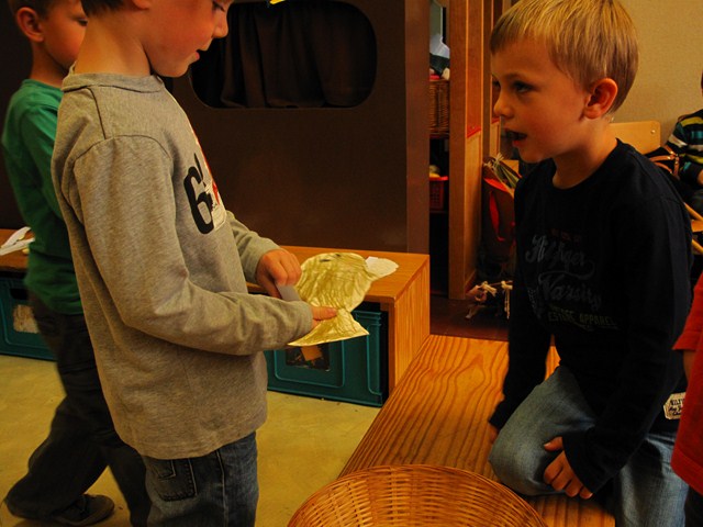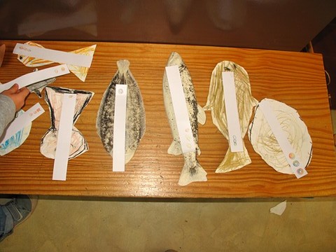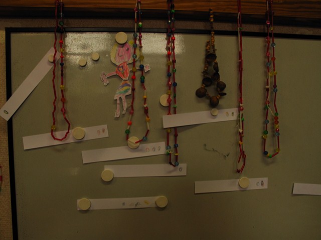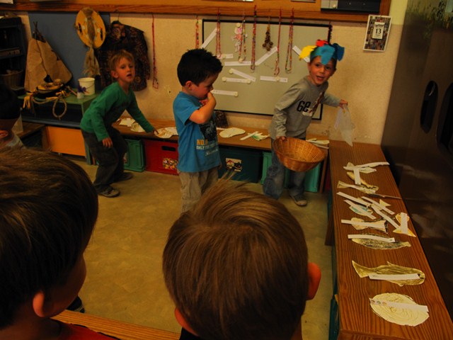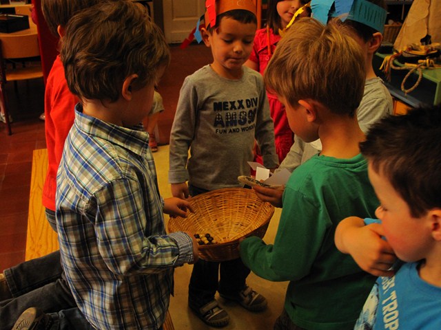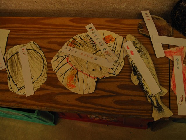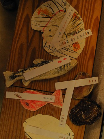 Daarna leggen we de vissen in onze vissenkraam. We maken kaartjes waarop een aantal bolletjes aangeven tegen hoeveel kralen de indianen kunnen ruilen.