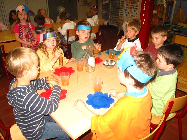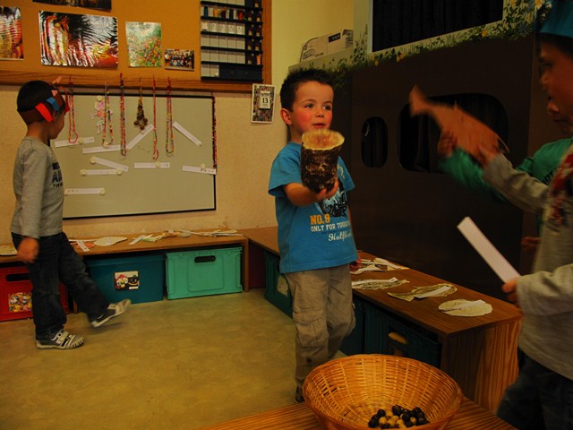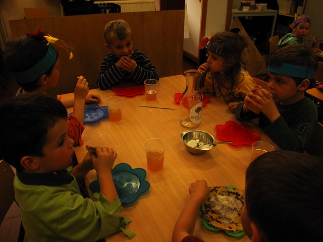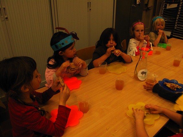Nadat we over maïs hebben geleerd, en we weten dat de indianen het fijnstampen met een vijzel, maken we lekkere maïskoeken, die we vouwen als een tipi.