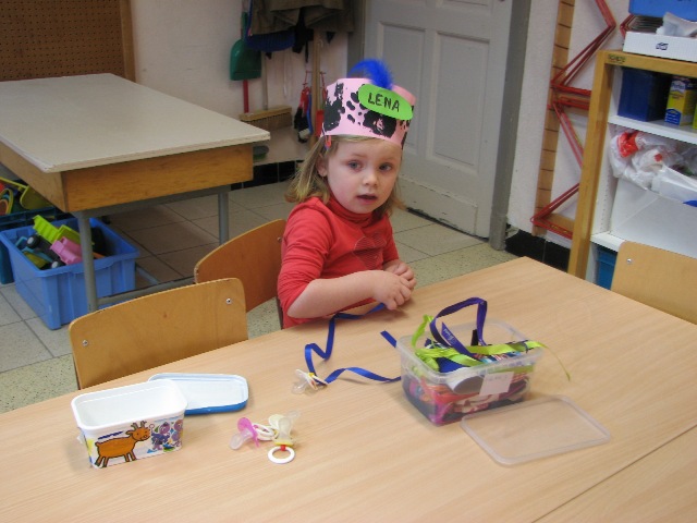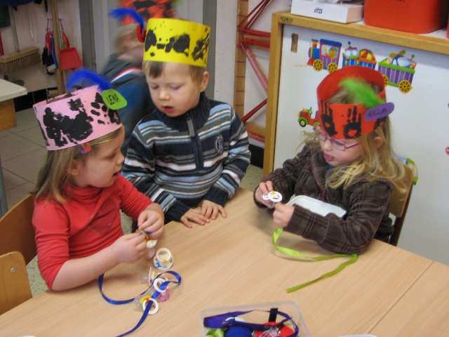 Lena en Ella maken van hun tutjes een mooie ketting voor Sint en Piet