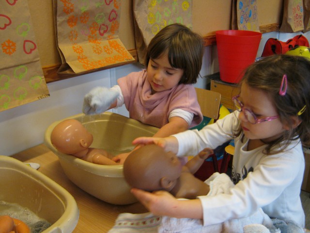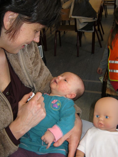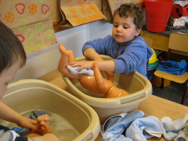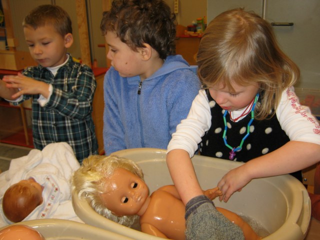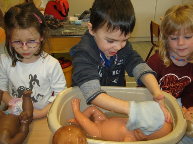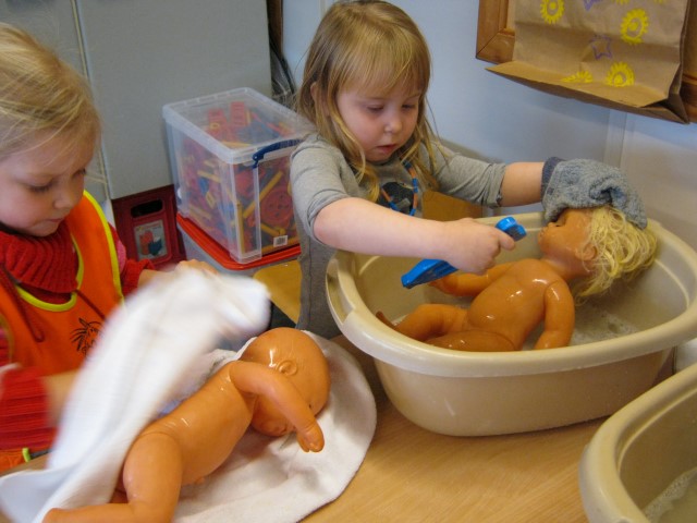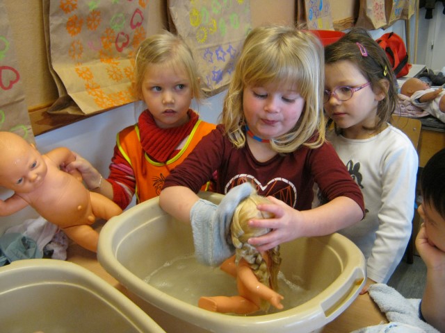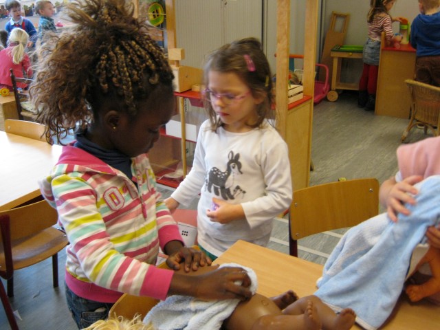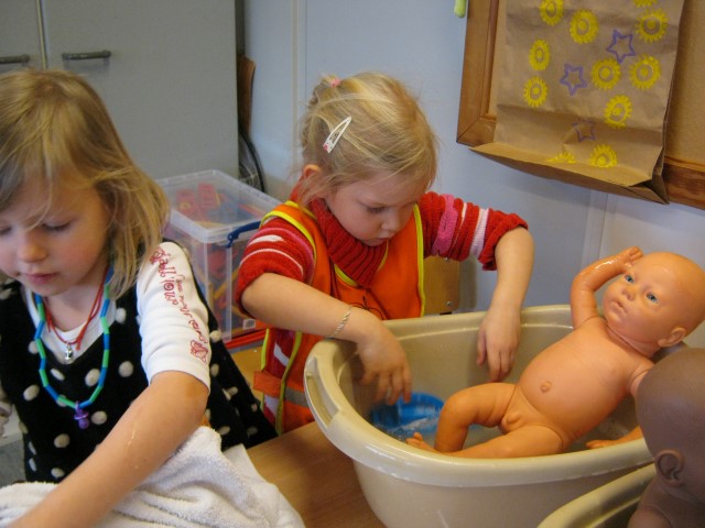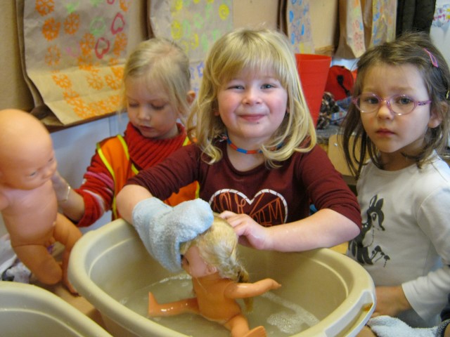 Yara kijkt naar de thermometer of het water niet te warm is.