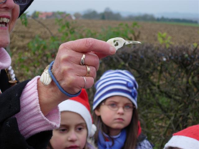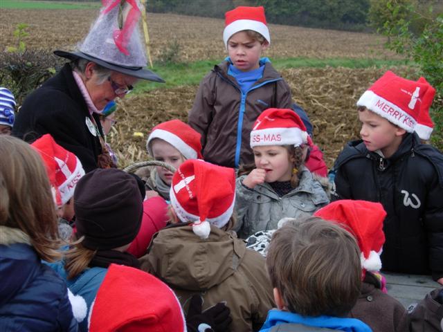 Luisteren naar de gids.Een elfenboom: een boom met 'knotsjes' waarop de elfen zitten.Zie je de staart van de eekhoorn nog?De nest van een vink.De schedel van een kauw.