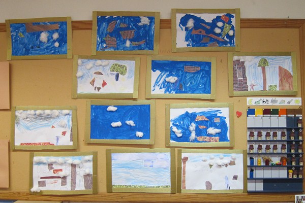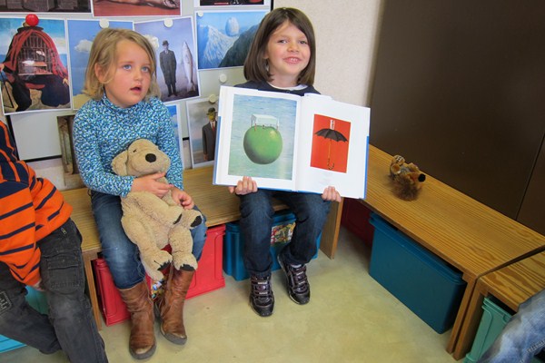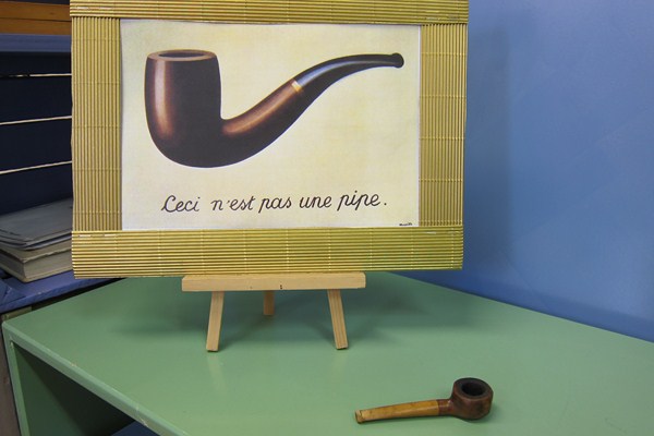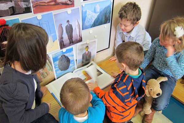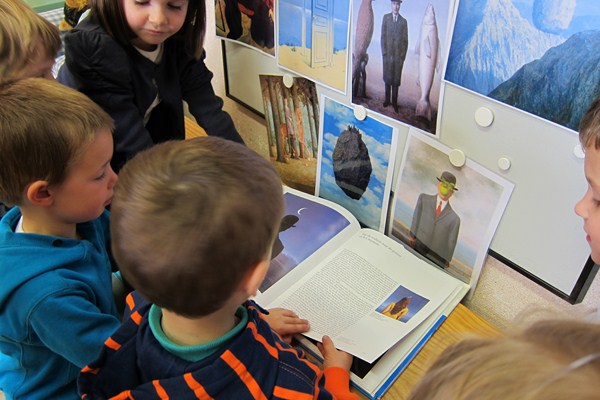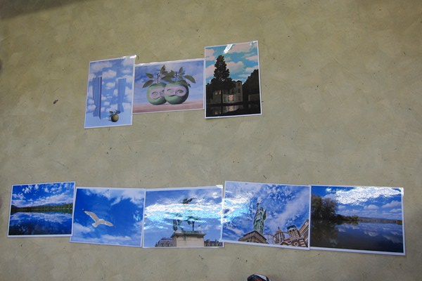 We bekijken schilderijen van Meneer Magritte en zien daarin... veel wolken, en heel veel dingen die in het echt niet kunnen