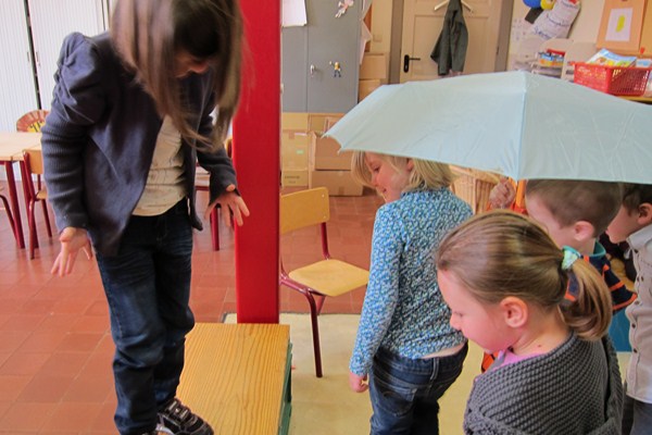 We zetten een beker met water bovenop de paraplu en wachten af of die blijft staan zonder omvallen...