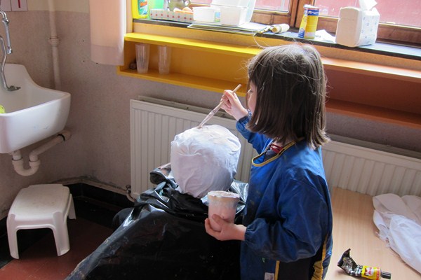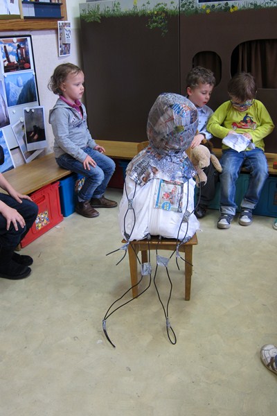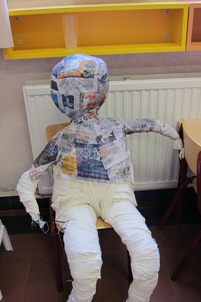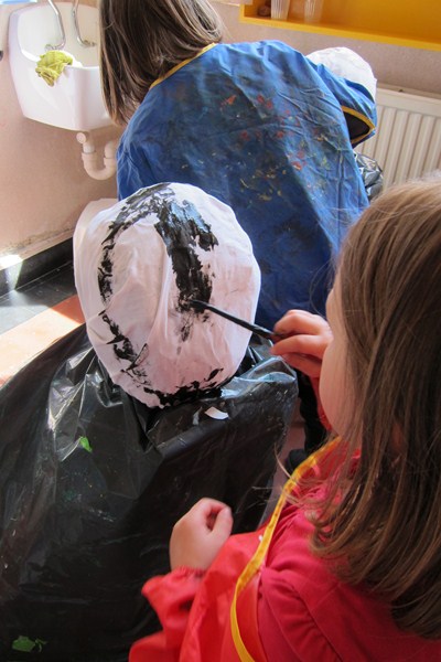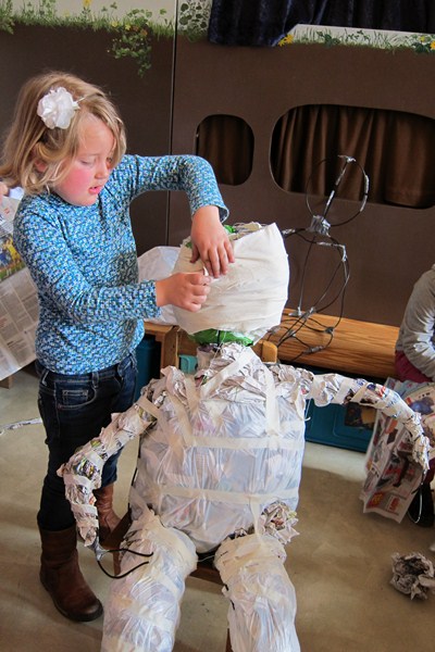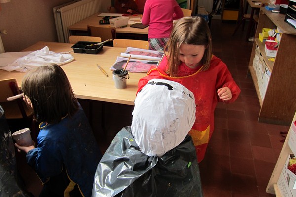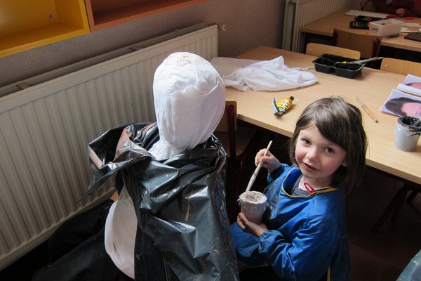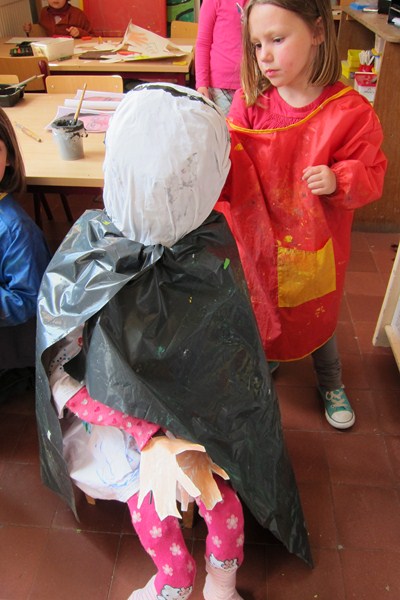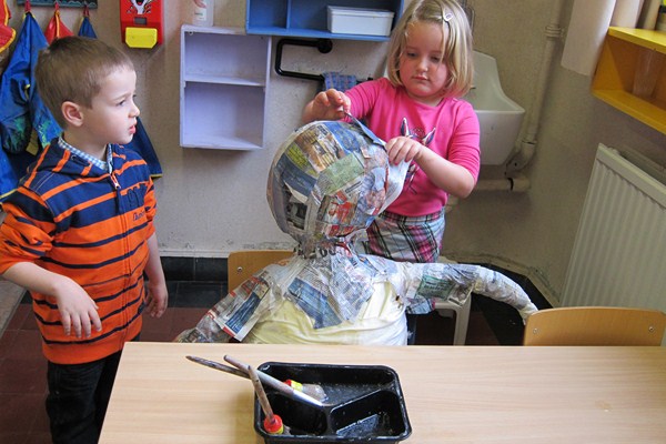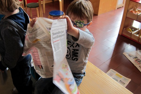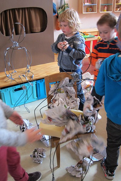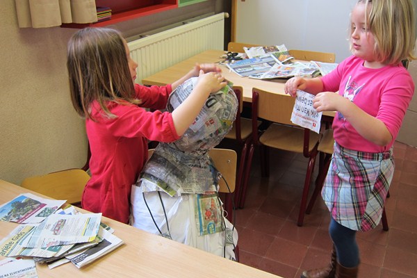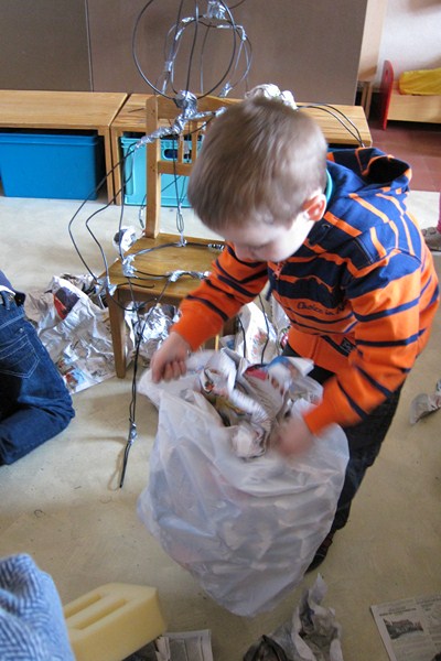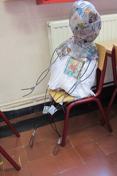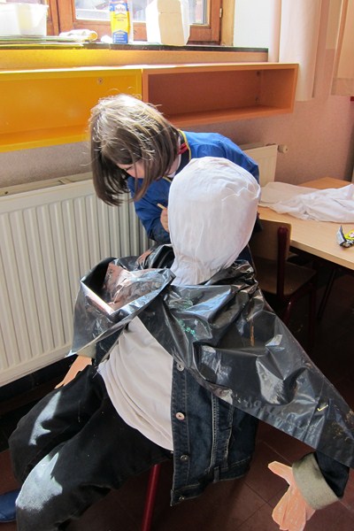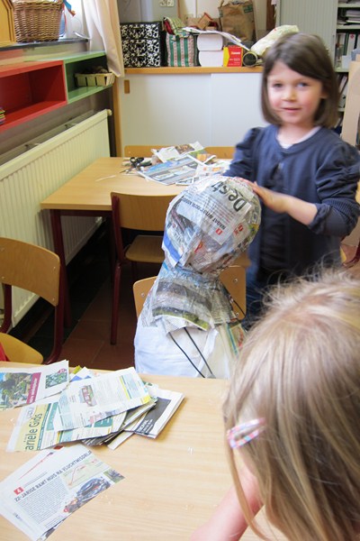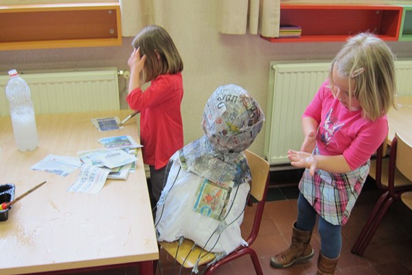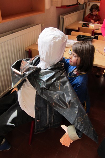 Werk in ons atelier: hoe vullen we de buiken? Met kranten? Die vallen er snel weer uit