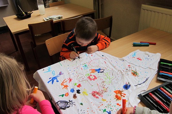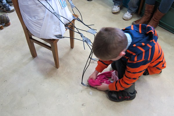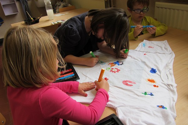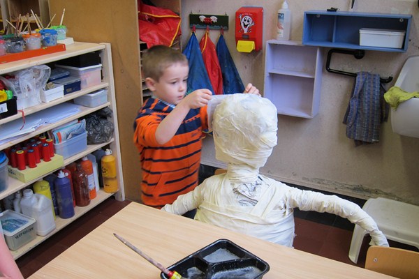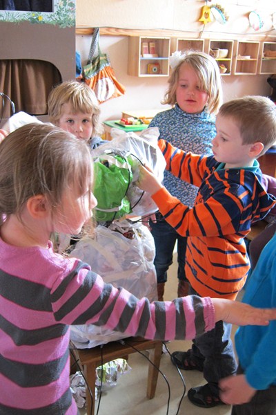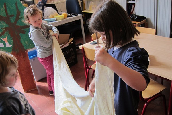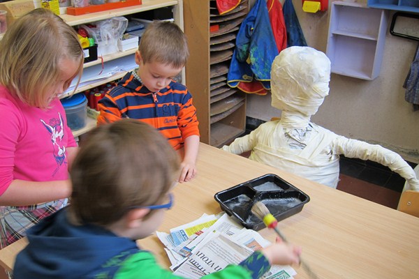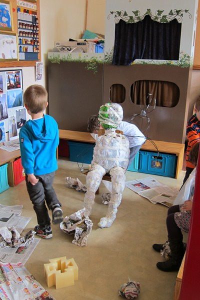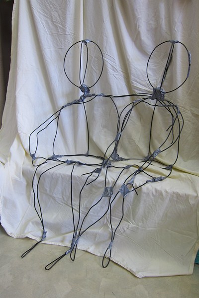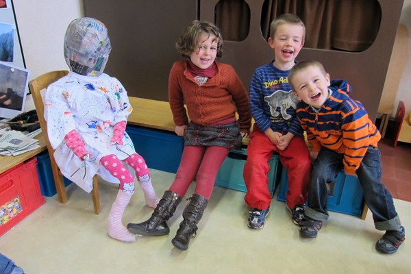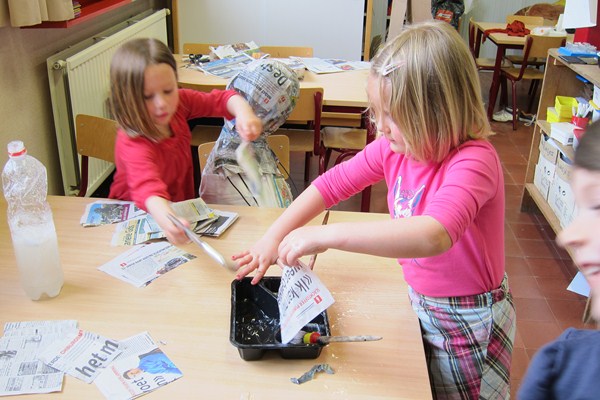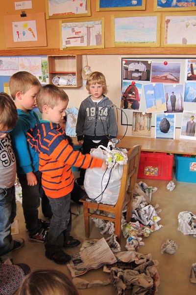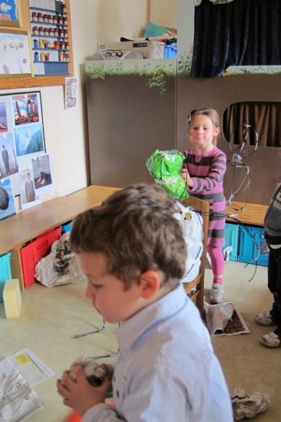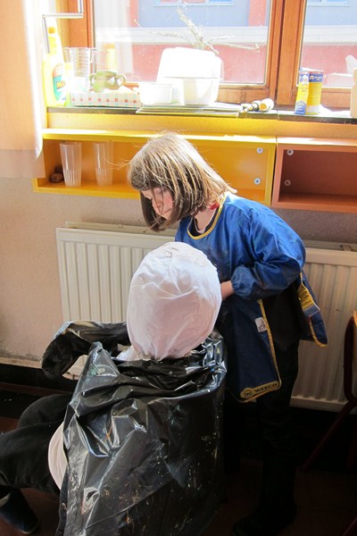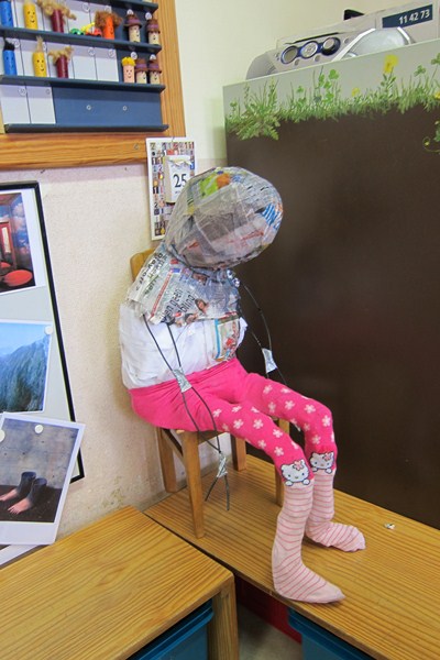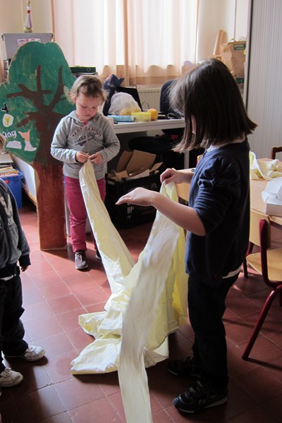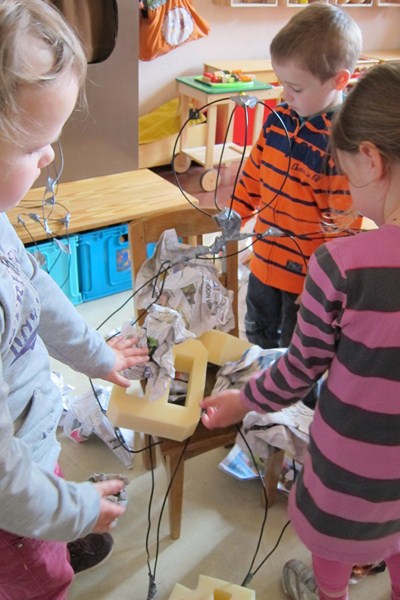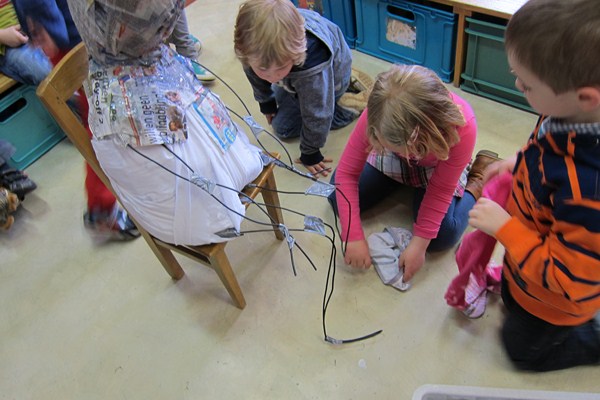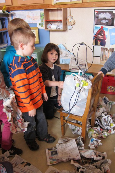 Werk in ons atelier: hoe vullen we de buiken? Met kranten? Die vallen er snel weer uit