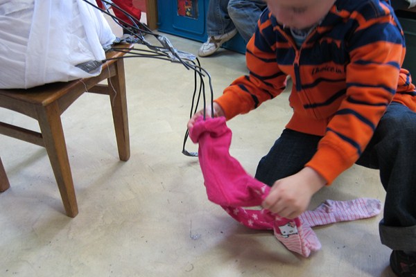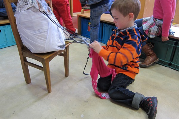 Dan maar alleen de kousenbroek, die we weer vullen met krantenproppen