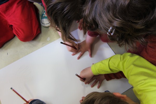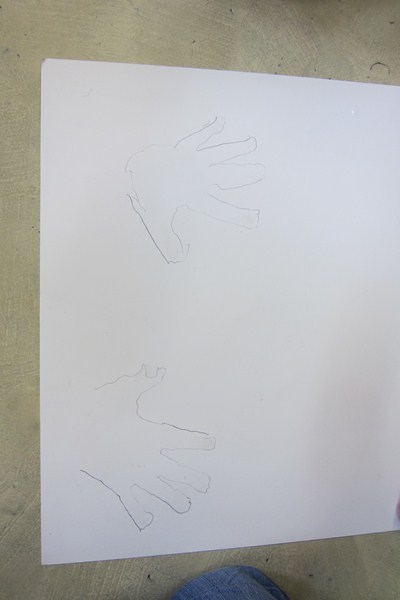 Handen omranden, inkleuren en uitknippen voor de poppen