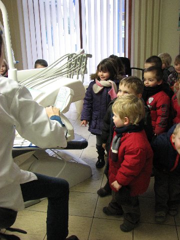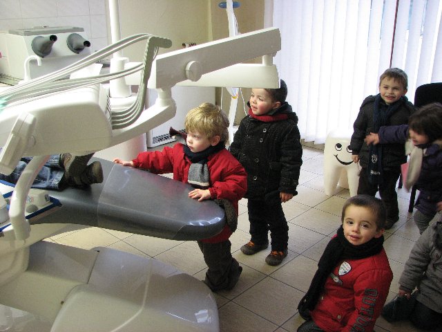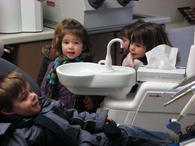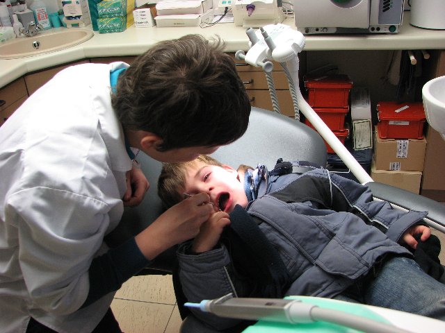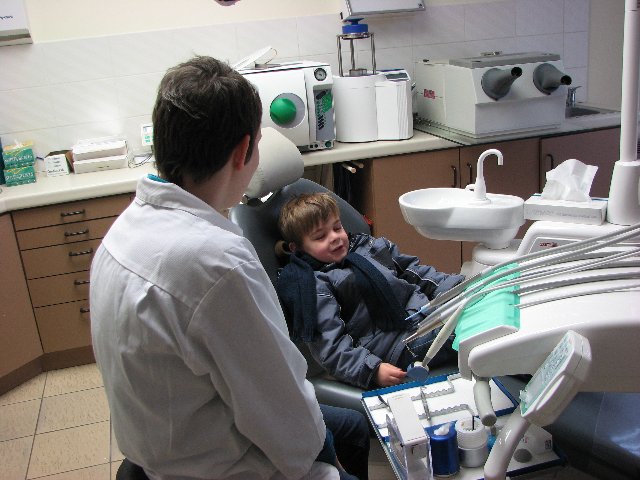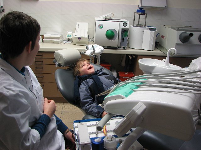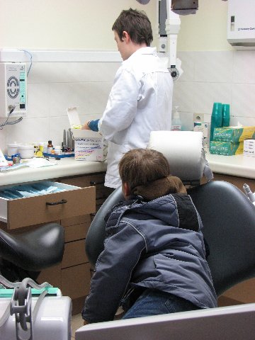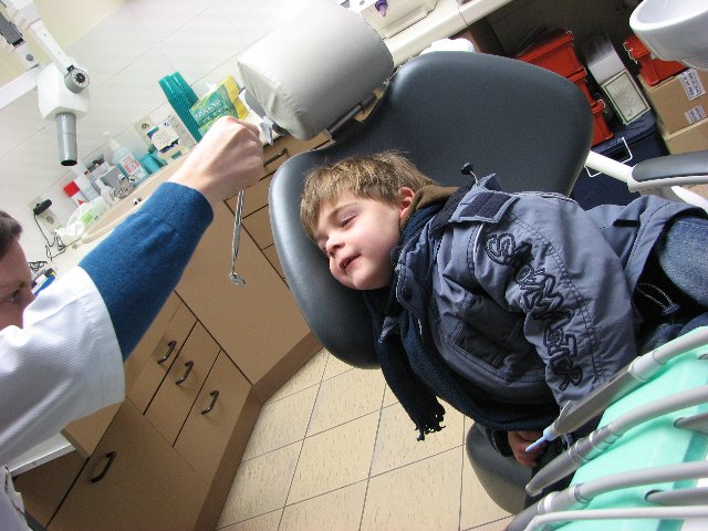 Tomas mocht eens in de stoel van de tandarts gaan liggen,.... hij was niet bang hoor, hij kende de tandarts want hij was daar al geweest. Eens kijken of er goed gepoetst is?...