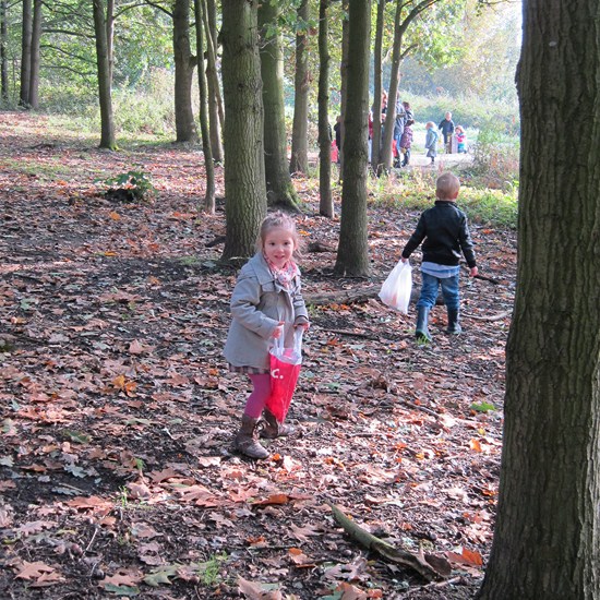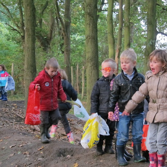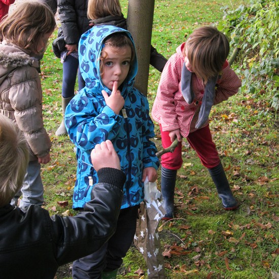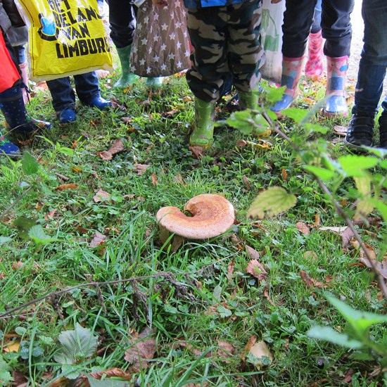 We ontdekken een hele grote paddenstoel en kleine elfenbankjes. We zien “voetsporen” op stammen, die in het echt de littekens van afgescheurde takken blijken te zijn.