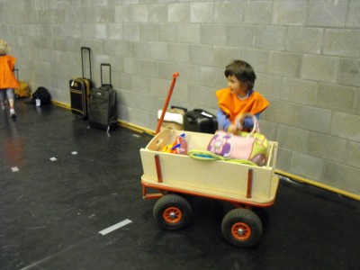 Alle bagage wordt naar het vliegtuig gebracht. Wat een overgewicht! Daar moet af en toe een kar aan te pas komen.