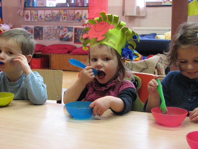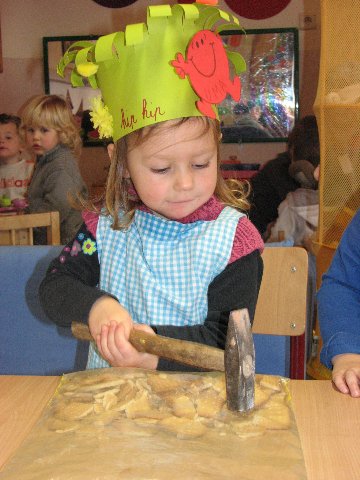 we maakten Pieten-chocoladetaart voor de verjaardag van Uma te vieren! Alle Pieten helpen mee. Hier zie je Pietje Uma de koekjes verkruimelen om in de taart te doen.