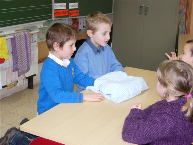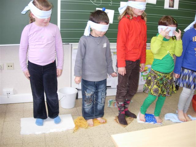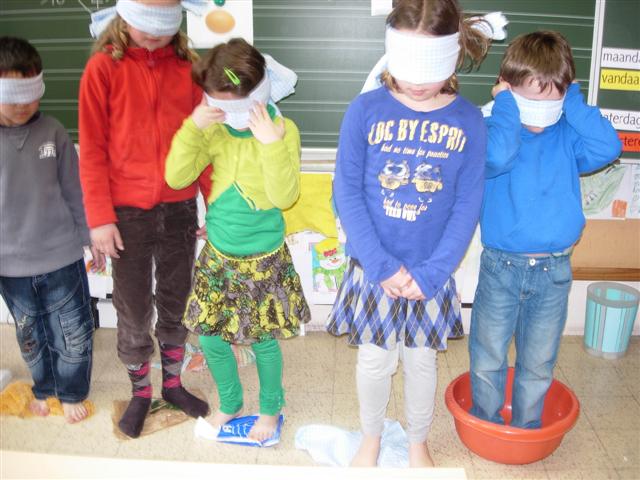 Voelen.Vind jij hetzelfde voorwerp als ik vastheb in de zak? Voelt dat van jou ook zacht, of is het ruw, stekelig of glad?Ook met onze voeten kunnen we voelen. Waarop sta ik?
