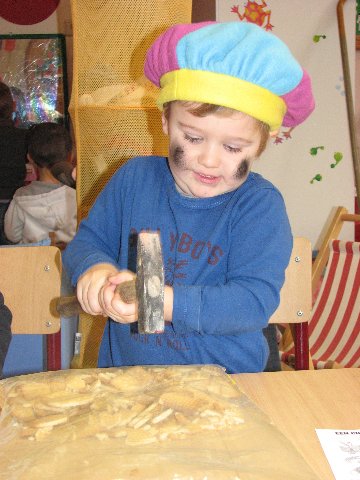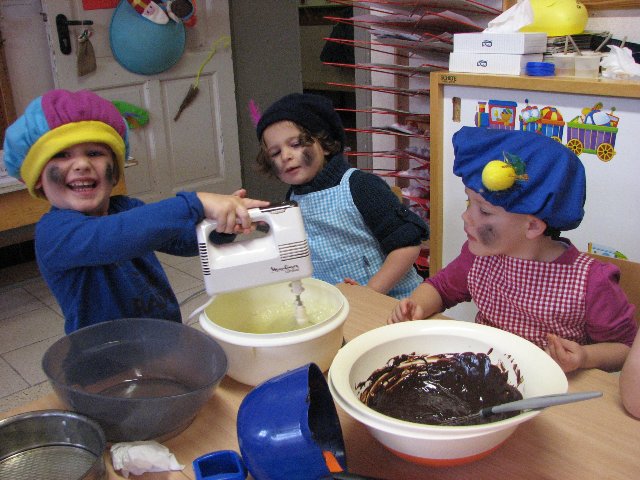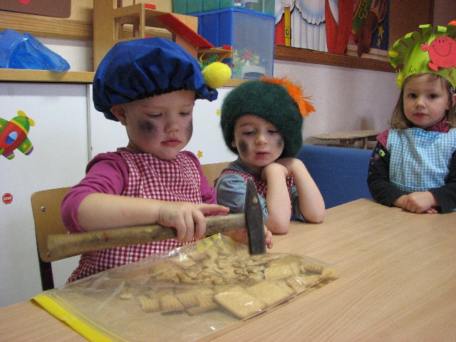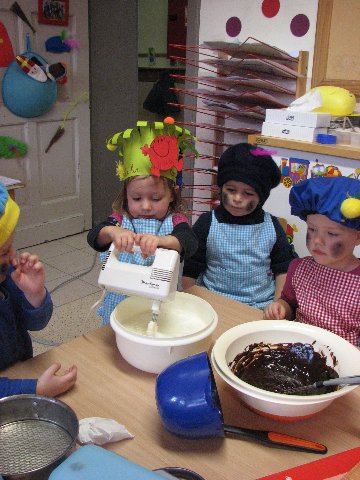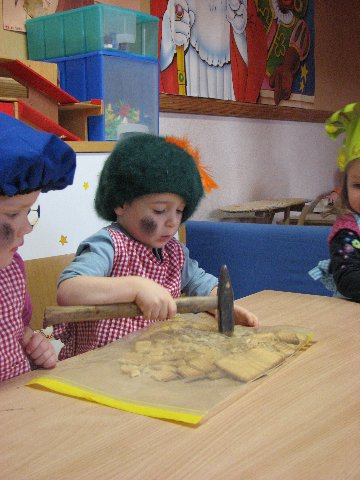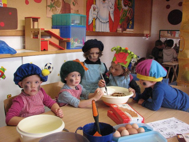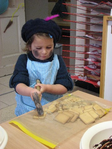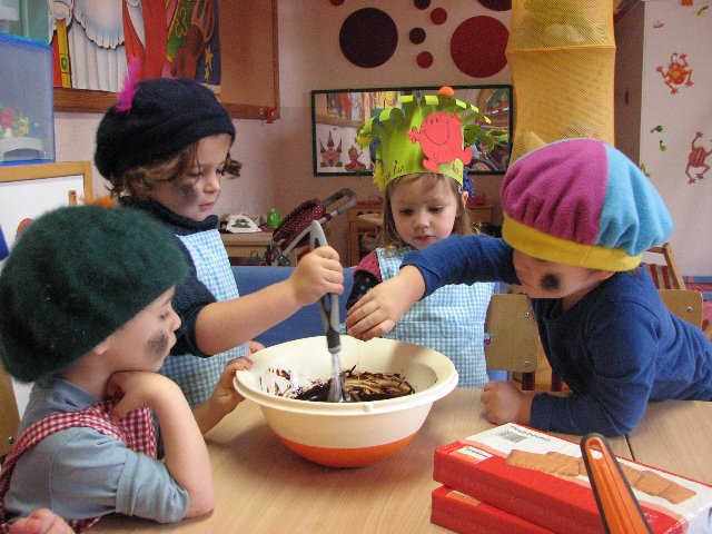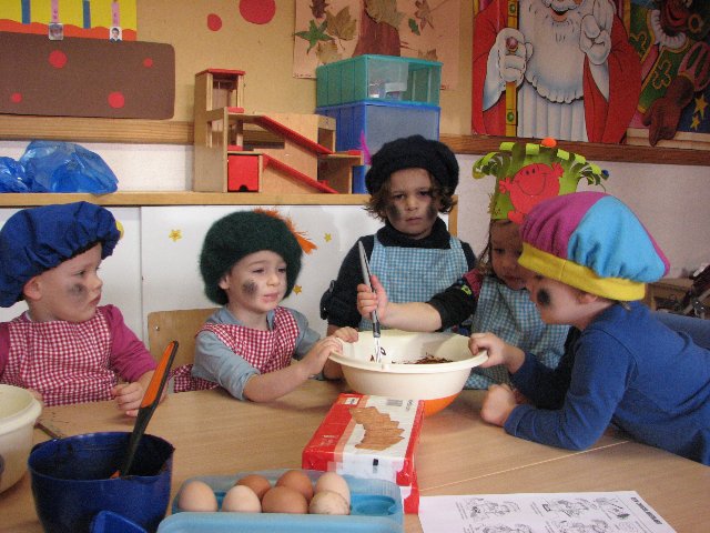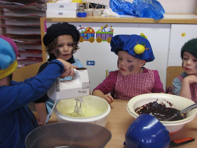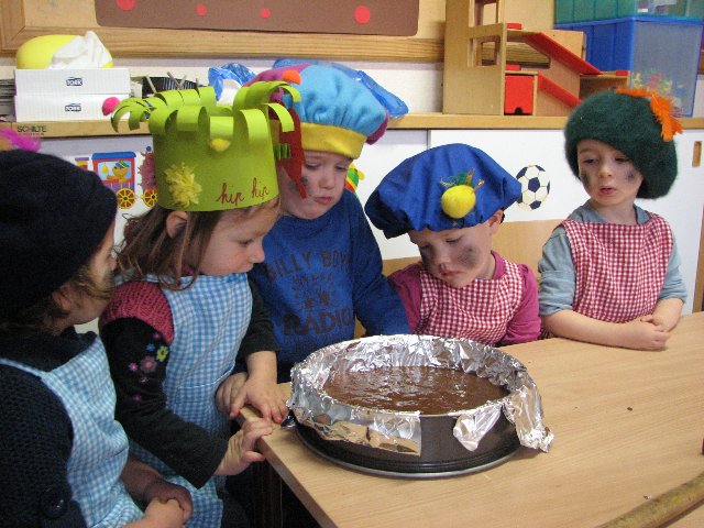 We maken Pieten-chocoladetaart ! De koekjes moeten heel goed verkruimeld zijn. Hier zie je de Kookpietjes dapper aan het werk. Klaar, nu moet de taart de koelkast in om op te stijven.