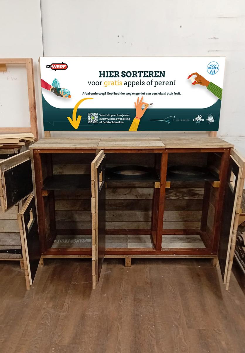 Vanuit haar circulaire standpunt, ontwierp EcoWerf samen met Materialenbank Leuven een vuilnisbak, gemaakt van het hout van oude fruitkisten van fruitteler Jan van Vanco Fruit in Linter. “We zijn trots dat we zo’n betrokken fruittelers hebben, die hiermee niet alleen bijdragen aan dit zwerfvuilproject, maar ook illustreren hoe circulaire oplossingen samen kunnen gaan met sociale tewerkstelling”, zegt schepen van Omgeving Andy Vandevelde uit Linter.