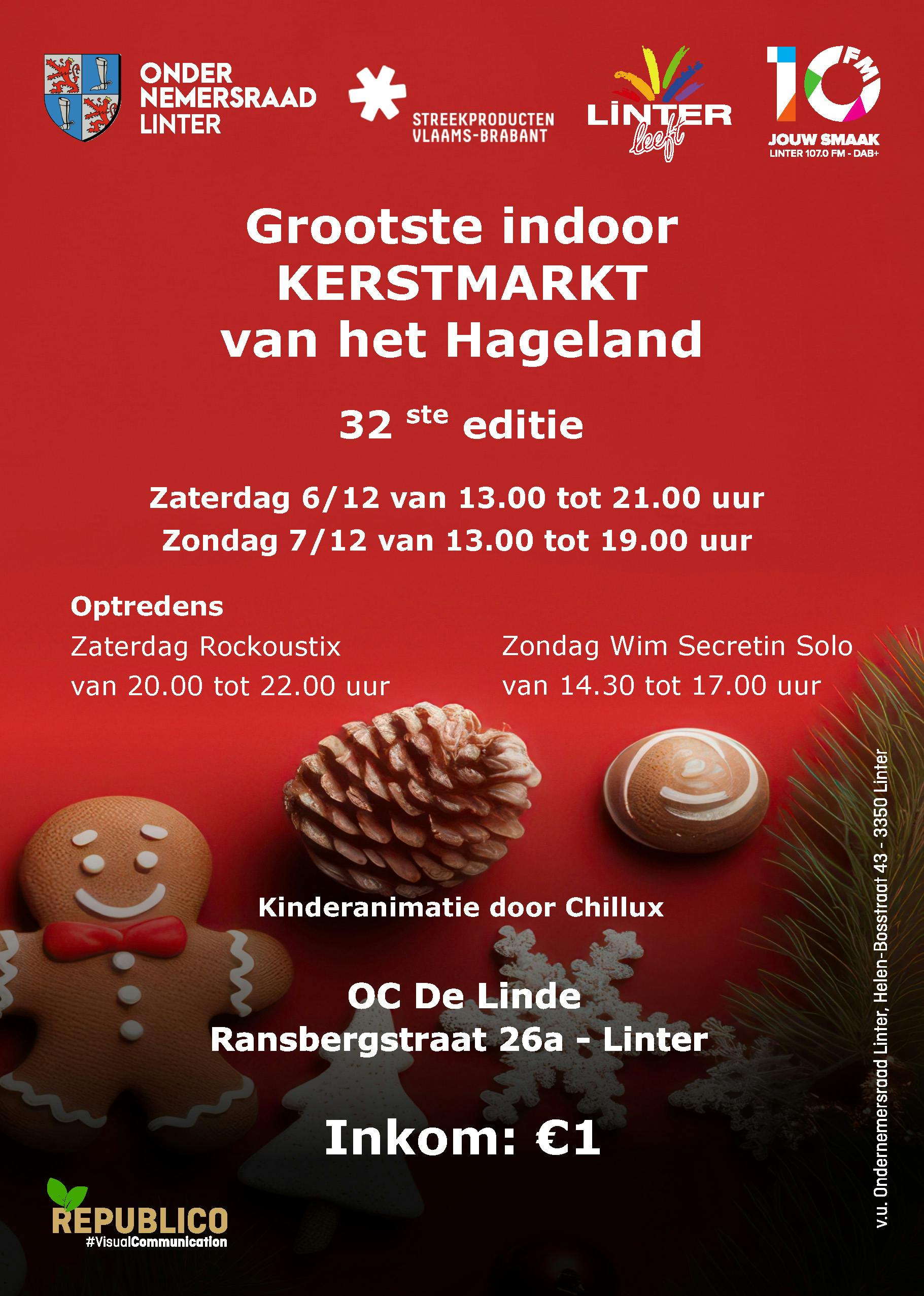 De ondernemersraad & gemeente Linter organiseren de grootste indoor kerstmarkt van het Hageland. Een gevarieerd aanbod van standhouders, hapje-tapje, optredens, kinderanimatie, ... Voor elk wat wils!