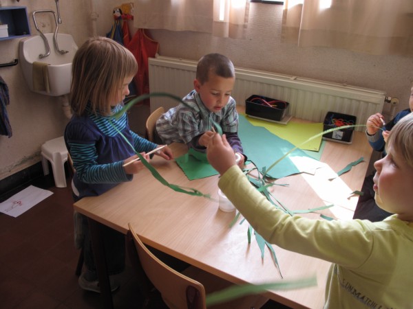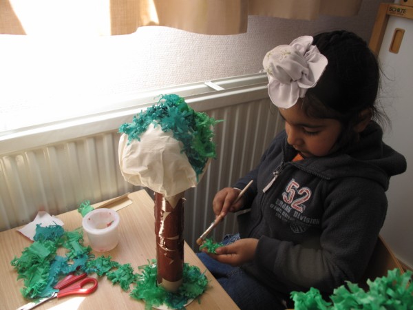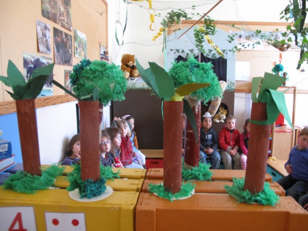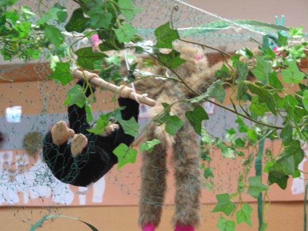 We vertellen een boek over het oerwoud en veranderen onze klas in een oerwoud.