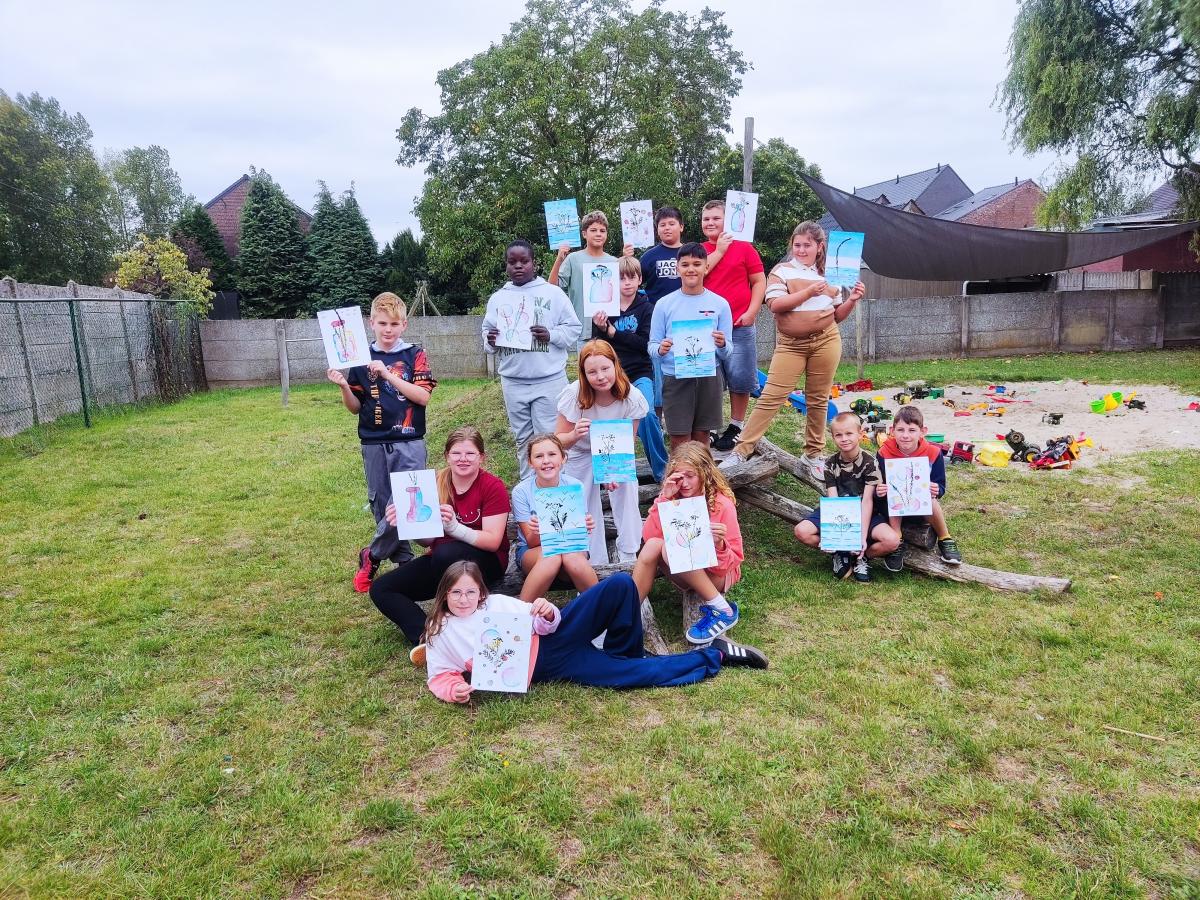 Foto: Leerlingen van de graadklas 5de en 6de leerjaar Drieslinter tonen trots hun kunstwerken, gemaakt tijdens de workshops “water en kleur” rond de Grote Gekte.